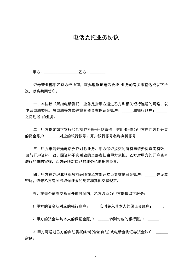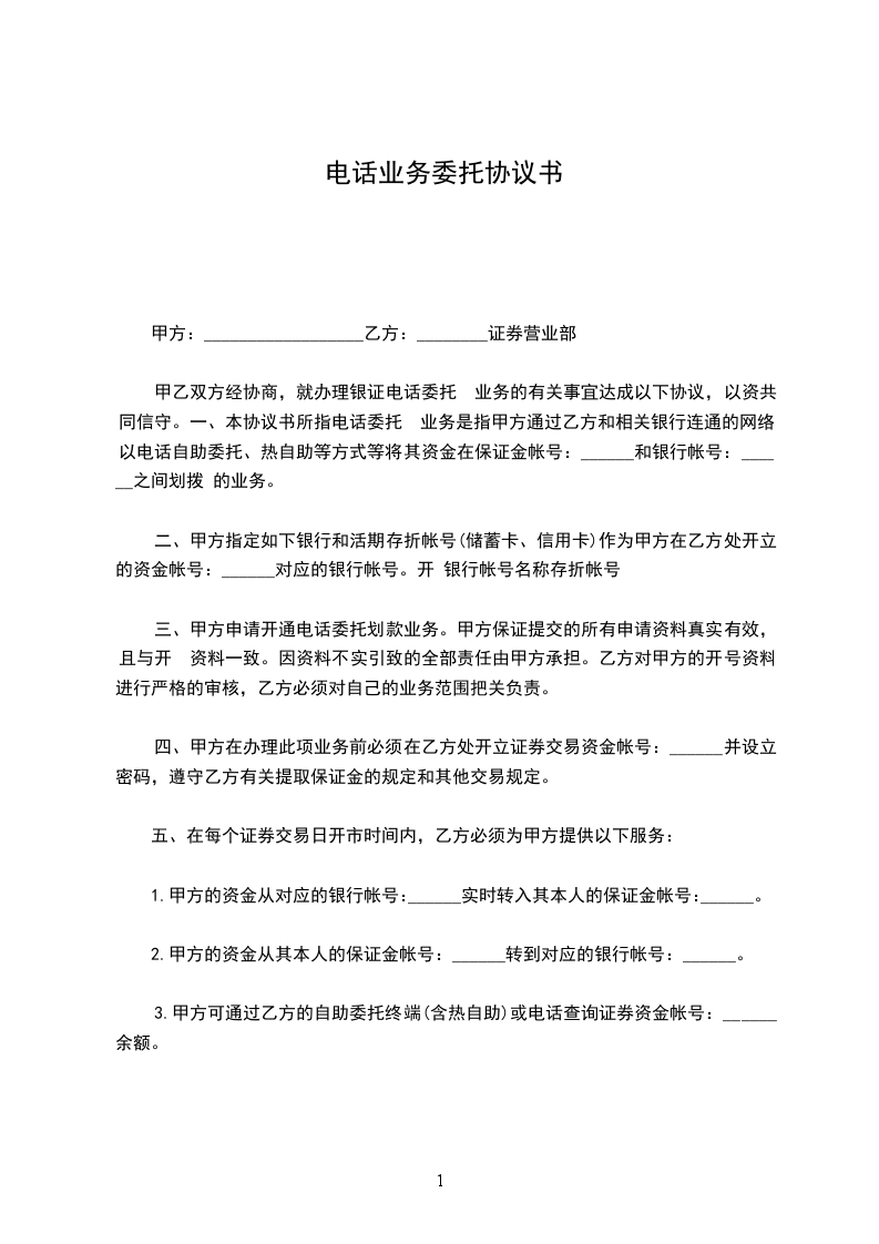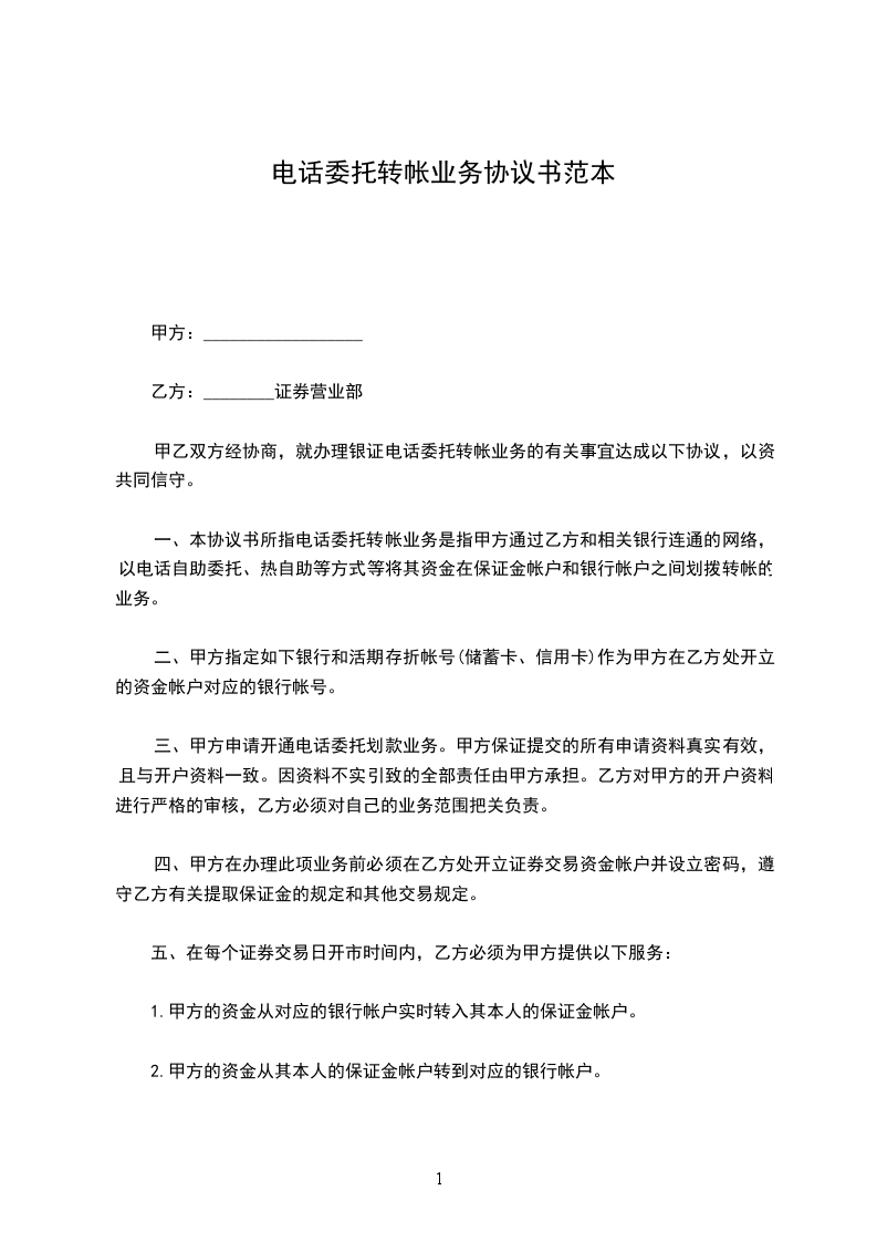 一、本协议书所指电话委托转帐业务是指甲方通过乙方和相关银行连通的网络,以电话自助委托、热自助等方式等将其资金在保证金账户和银行账户之间划拨转帐的业务。