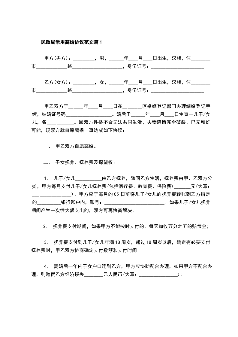 全新民政局常用离婚协议样本篇1