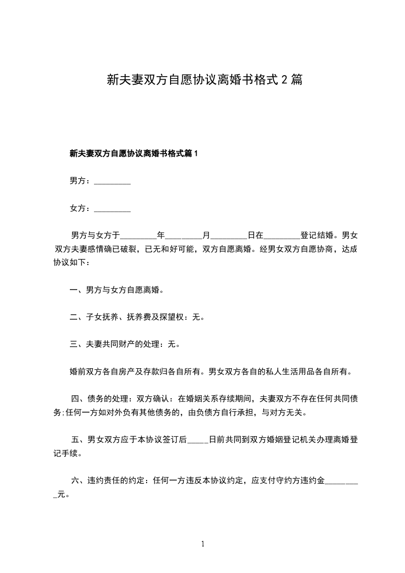 男方与女方于_________年_________月_________日在_________登记结婚。男女双方夫妻感情确已破裂,已无和好可能,双方自愿离婚。经男女双方自愿协商,达成协议如下: