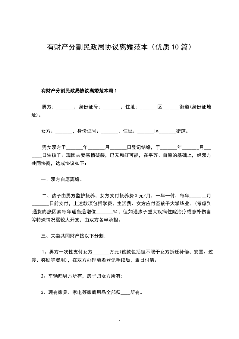 男方与女方于______年____月相识,并于______年____月____日在_________民政局登记结婚,婚后于______年____月____日生育一儿子,名_________。因____________________________致使夫妻双方感情破裂,且已无任何和好可能,现经双方自愿协商达成一致意见,订立离婚协议如下: