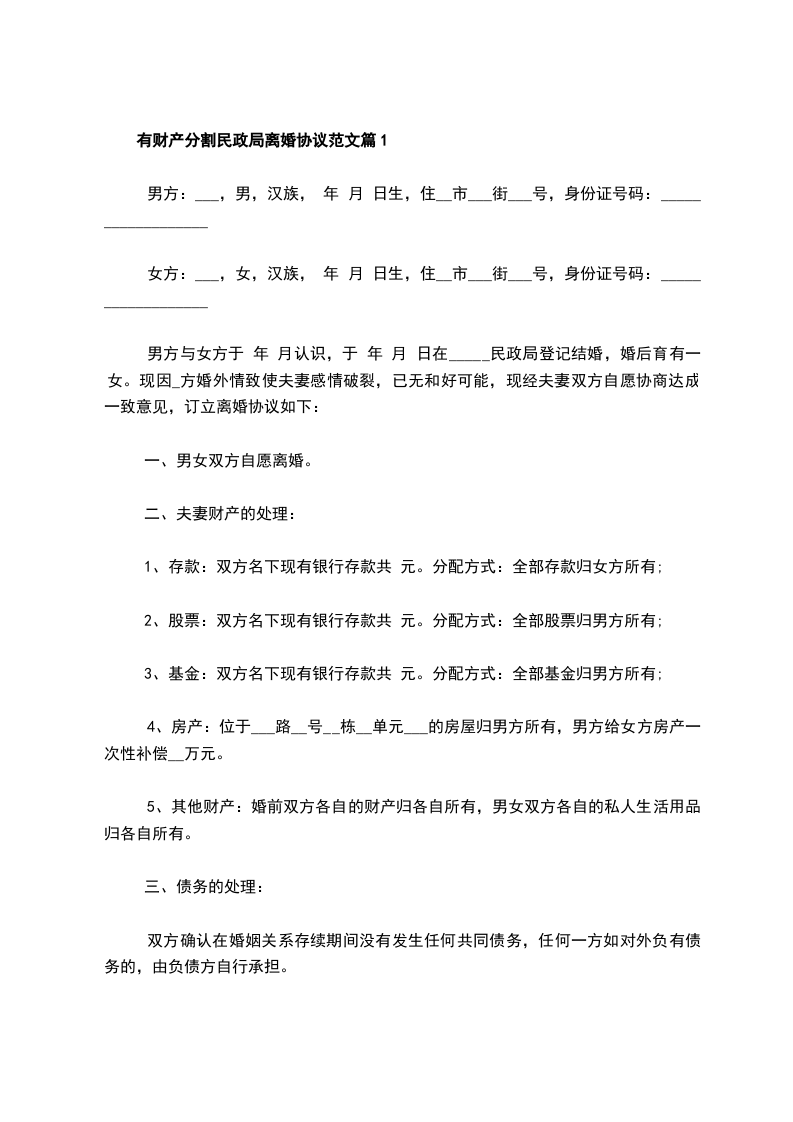 1、 存款:双方确认共同存款 元人民币(大写: ),双方约定于___年___月___日前,甲方分得 元人民币(大写: ),乙方分得 元人民币(大写:);