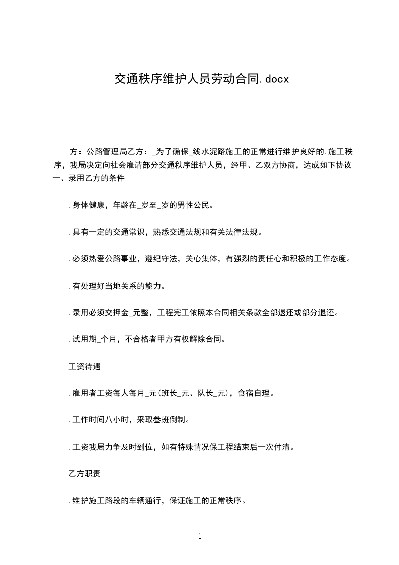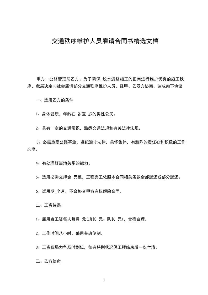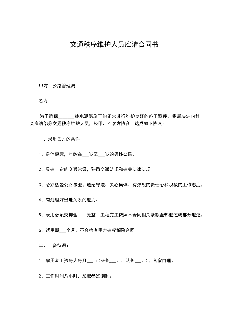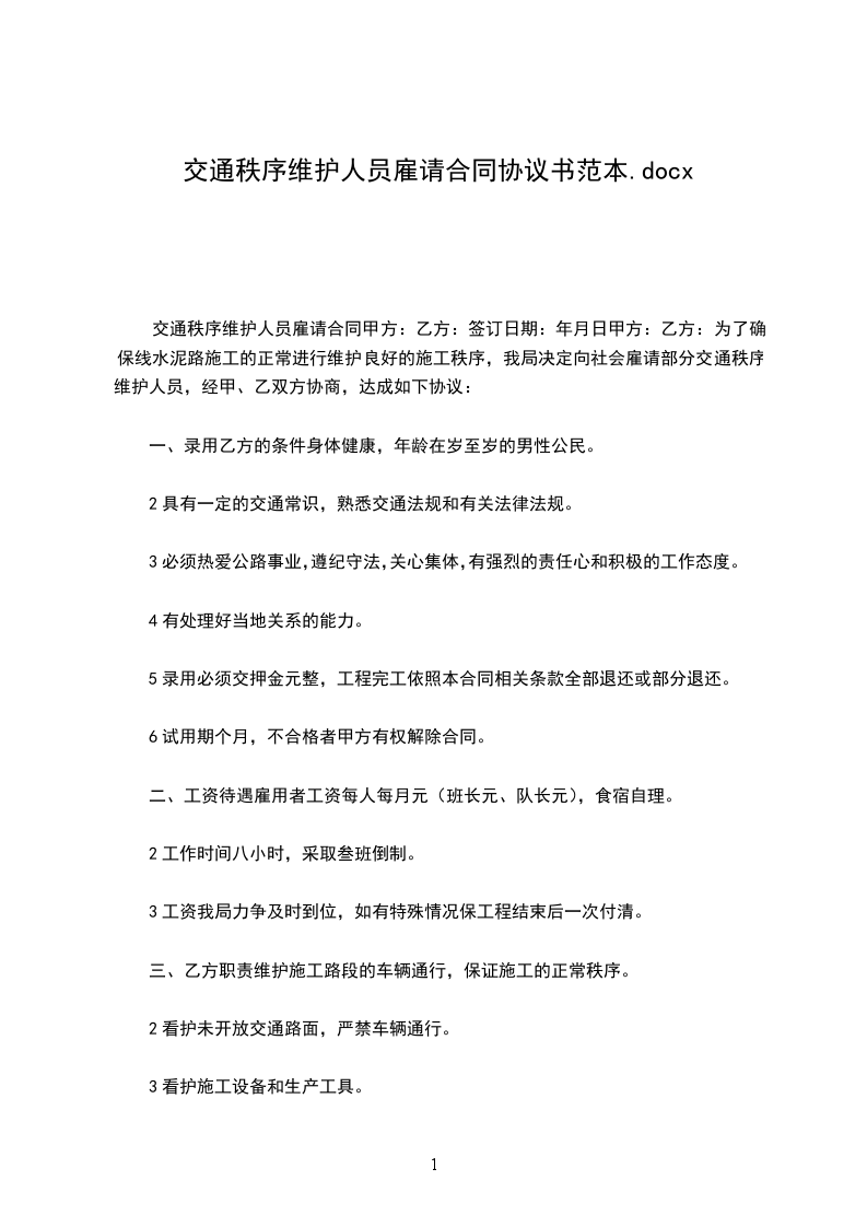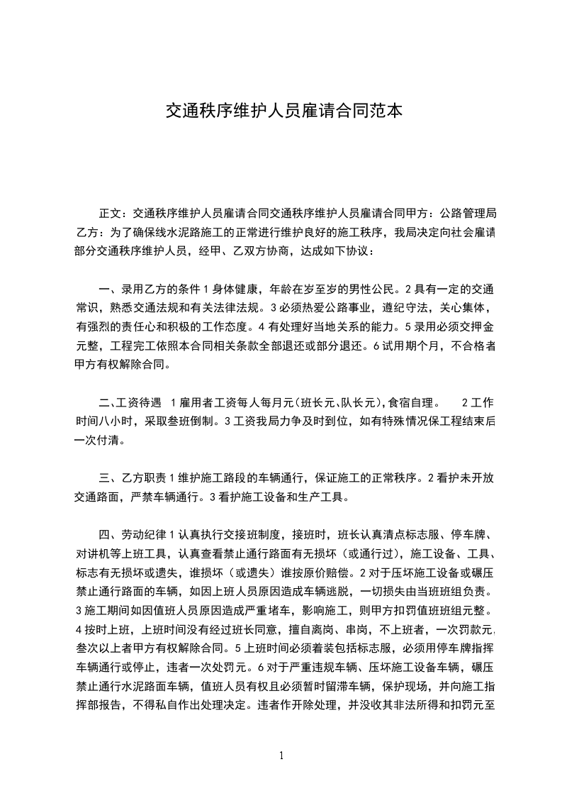 为了确保_______线水泥路施工的正常进行维护良好的施工秩序,我局决定向社会雇请部分交通秩序维护人员,经甲、乙双方协商,达成如下协议: