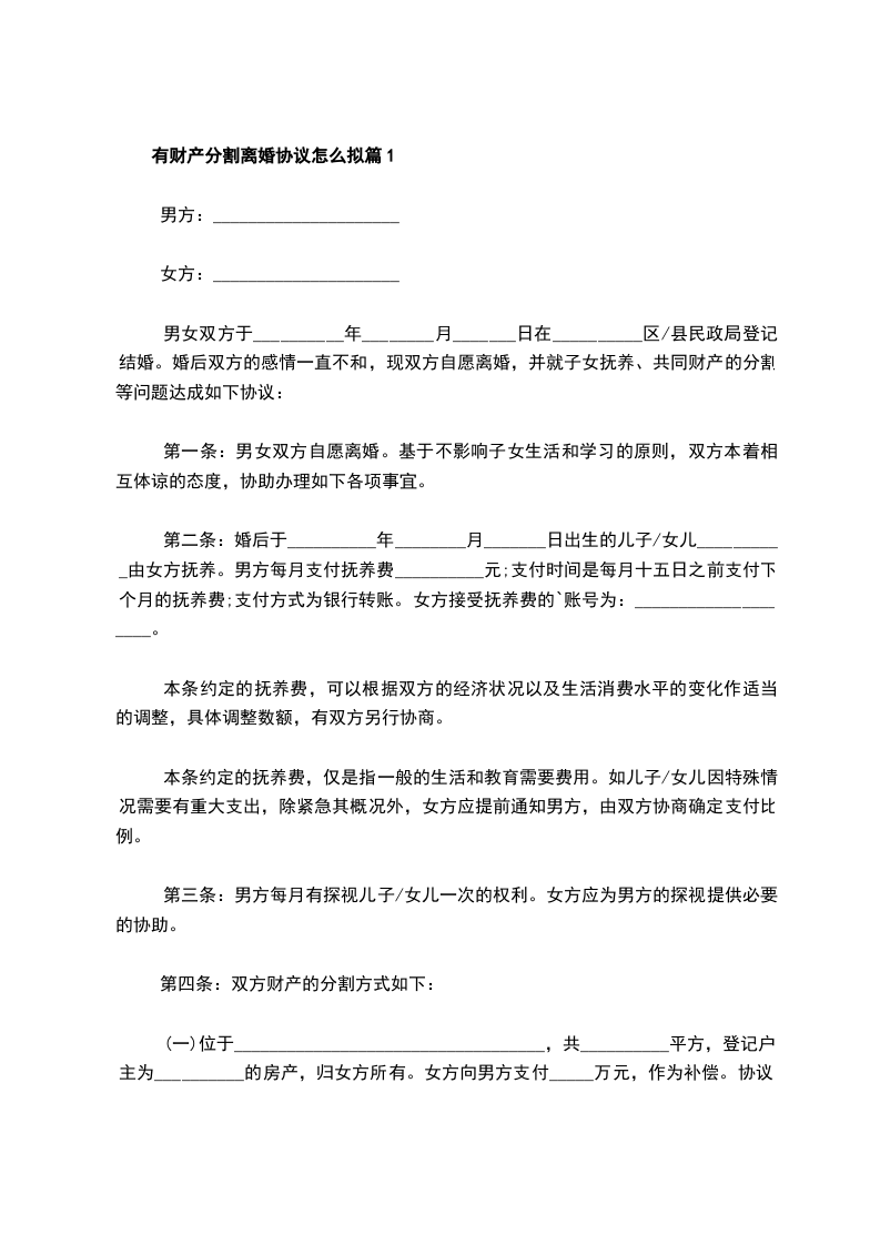 (1)存款:_________方名下存款_________元,_________方名下存款_________元,共计_________元,双方各分一半,为_________元。分配方式:各自名下的存款保持不变,但_________方应于______年____月____日前一次性支付_________元给_________方。