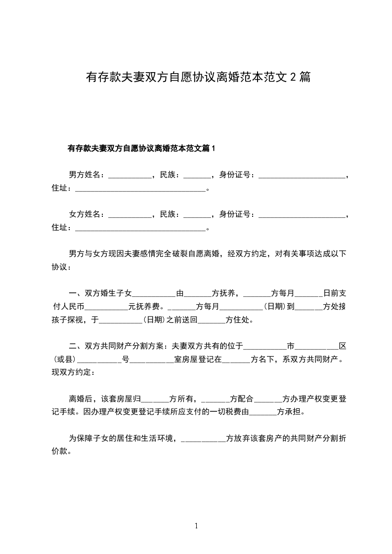 有存款双方自愿离婚协议书格式篇1