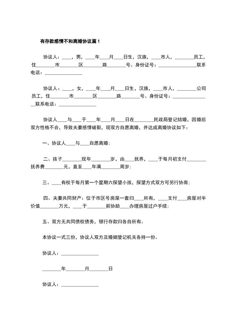 (1)存款:双方名下现有银行存款共______元,双方各分一半,为______元。分配方式:各自名下的存款保持不变,但男方(女方)应于____年__月__日前一次性支付____元给女方(男方)。
