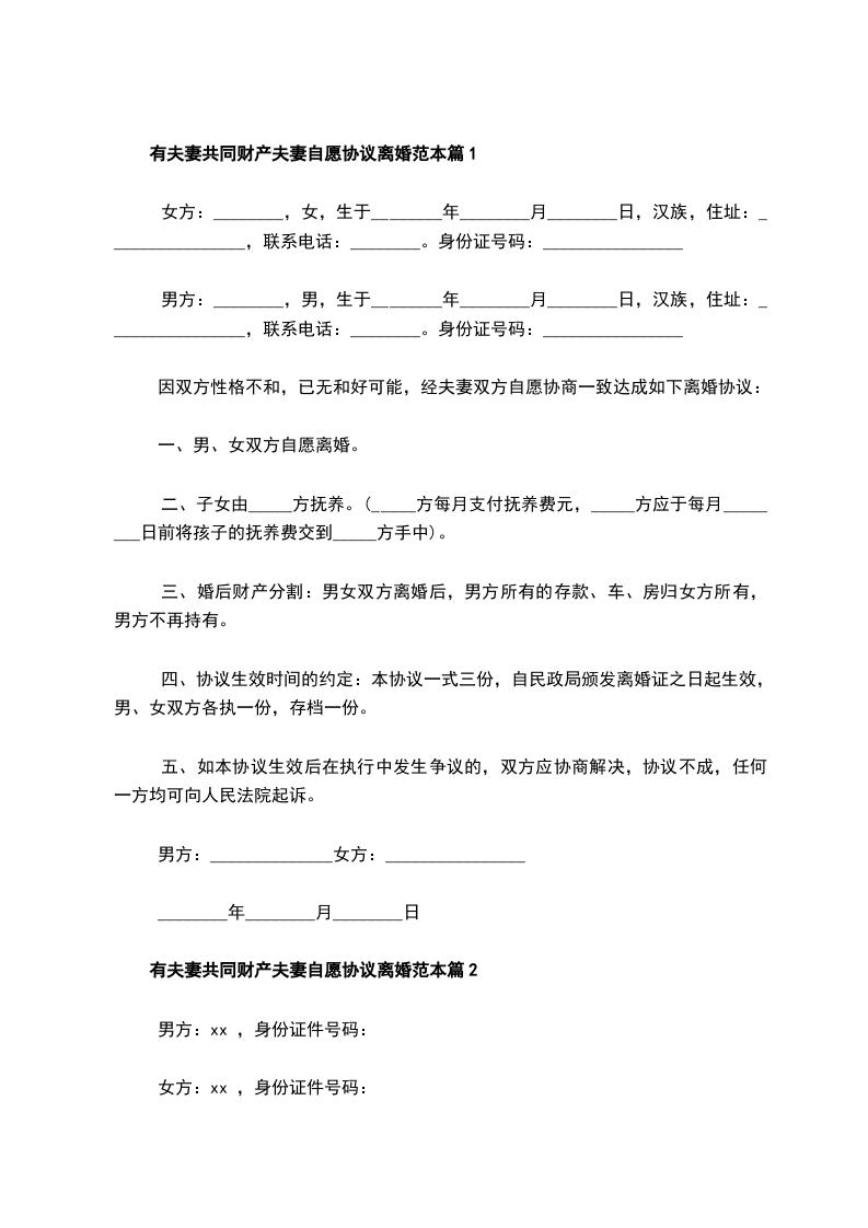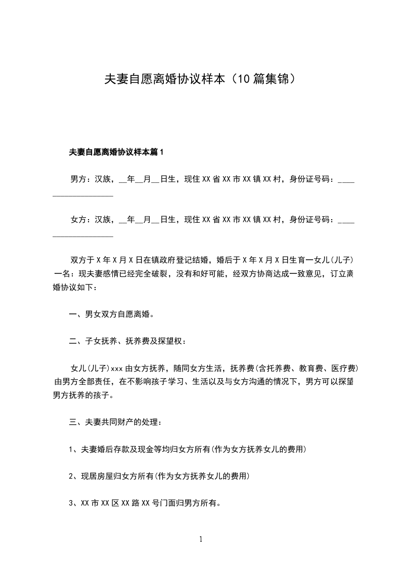夫妻自愿离婚协议书参考样式篇10