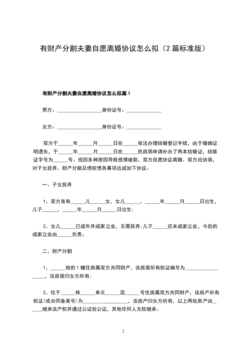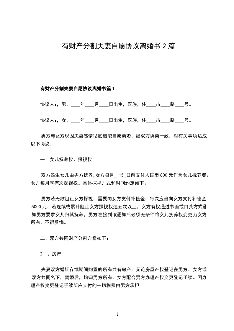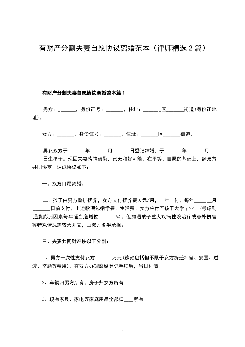 有财产分割夫妻自愿协议离婚书篇1