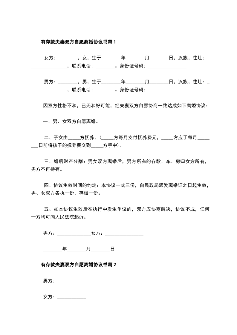 1、 存款:双方确认共同存款 元人民币(大写: ),双方约定于___年___月___日前,甲方分得 元人民币(大写: ),乙方分得 元人民币(大写:);