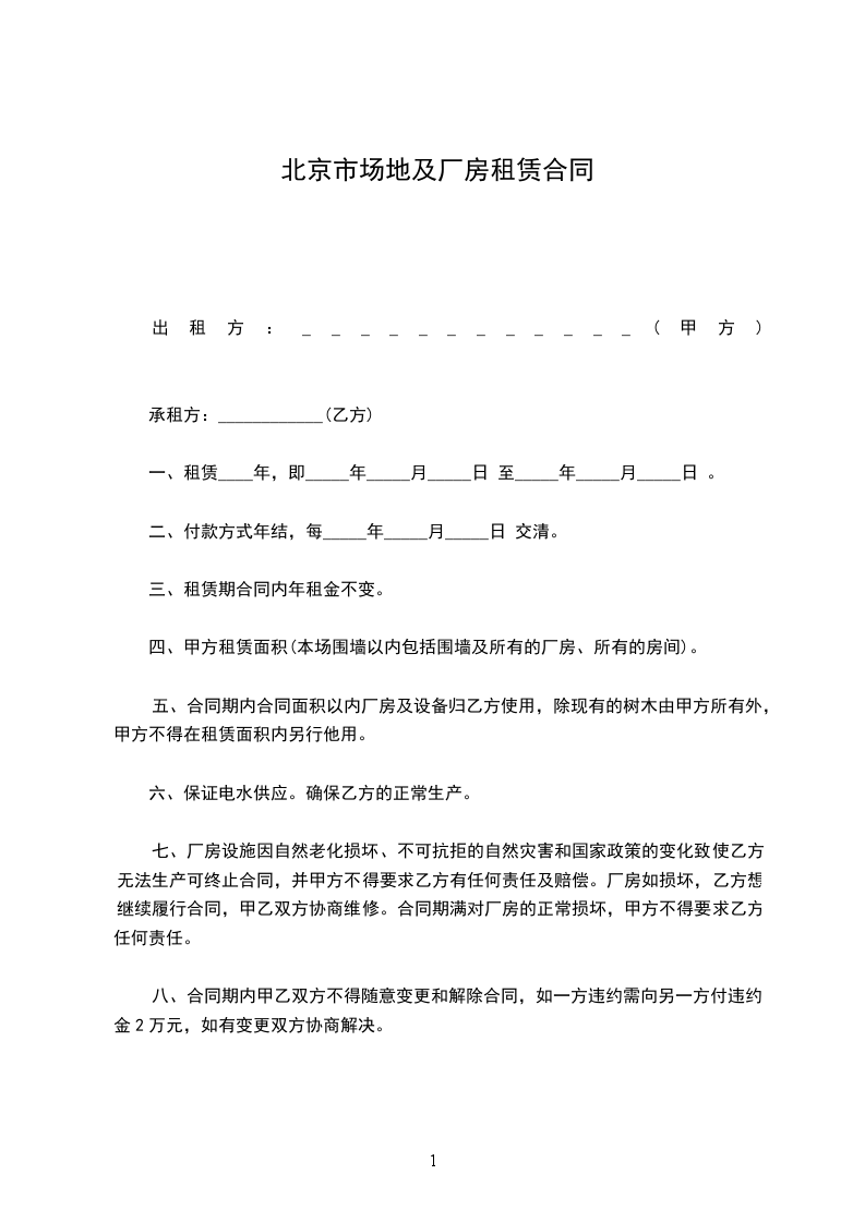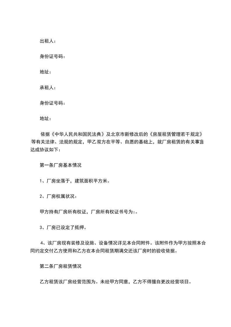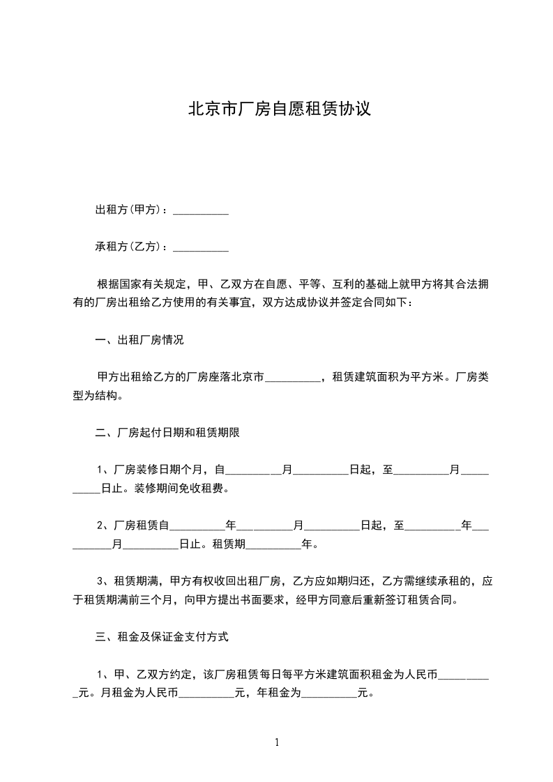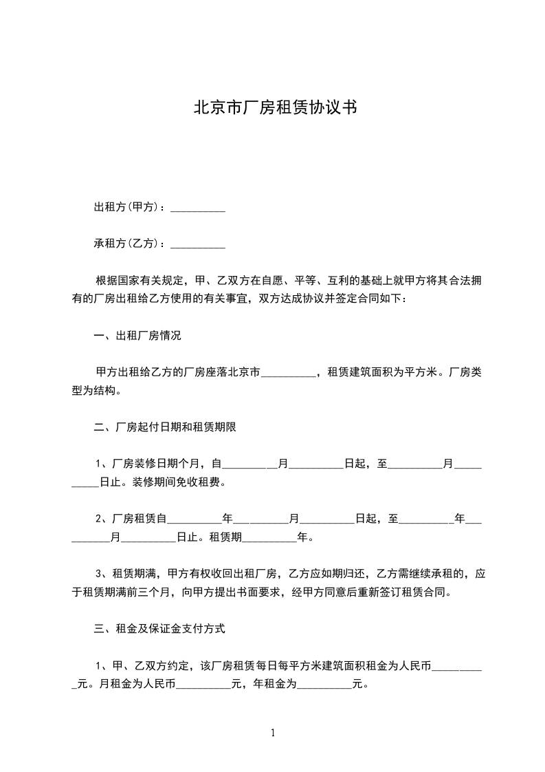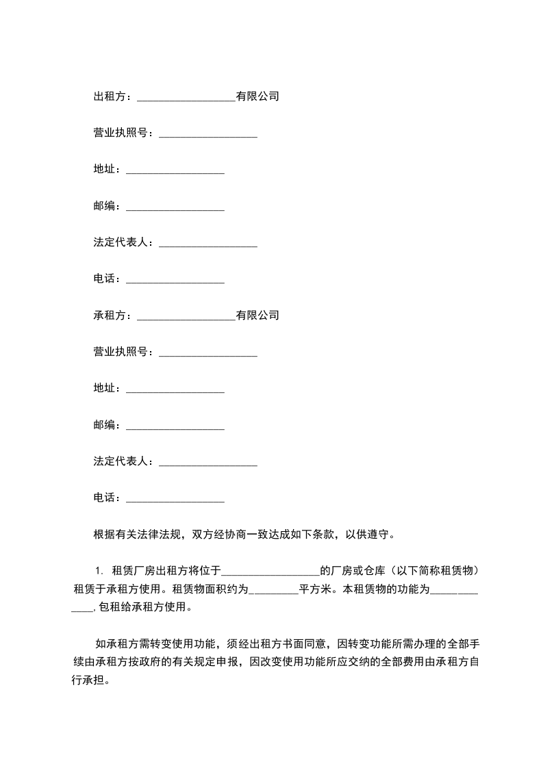 1. 租赁厂房出租方将位于__________________的厂房或仓库(以下简称租赁物)租赁于承租方使用。租赁物面积约为_________平方米。本租赁物的功能为_____________,包租给承租方使用。