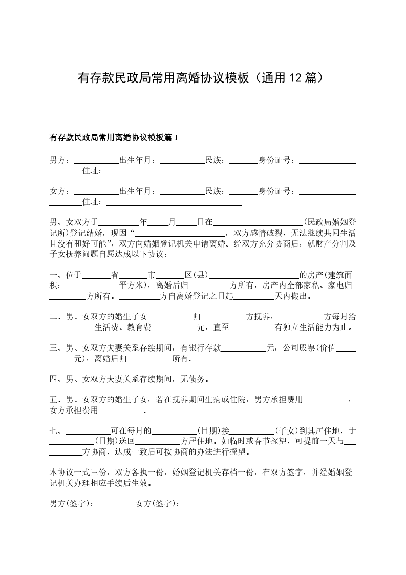 1、【存款】双方婚姻关系存续期间,目前共有存款____元,其中男方账户____元,女方账户____元,双方同意,____方在本协议签订之日起3日内给付____方____元。