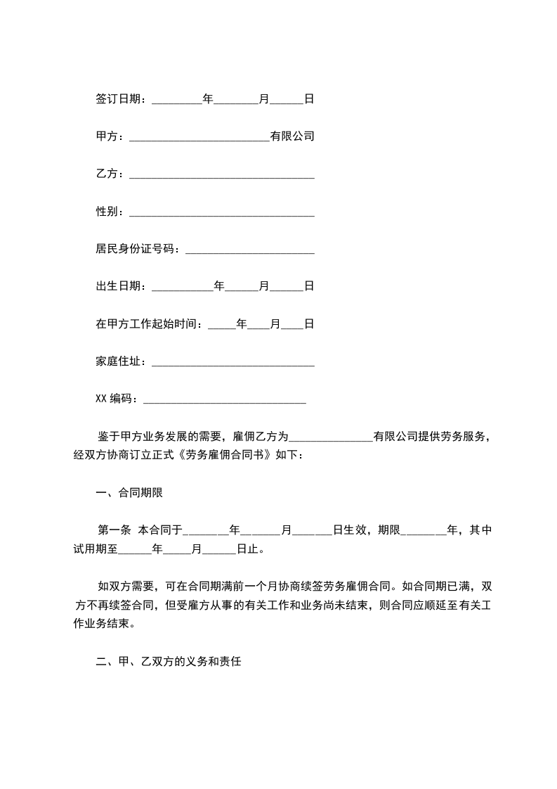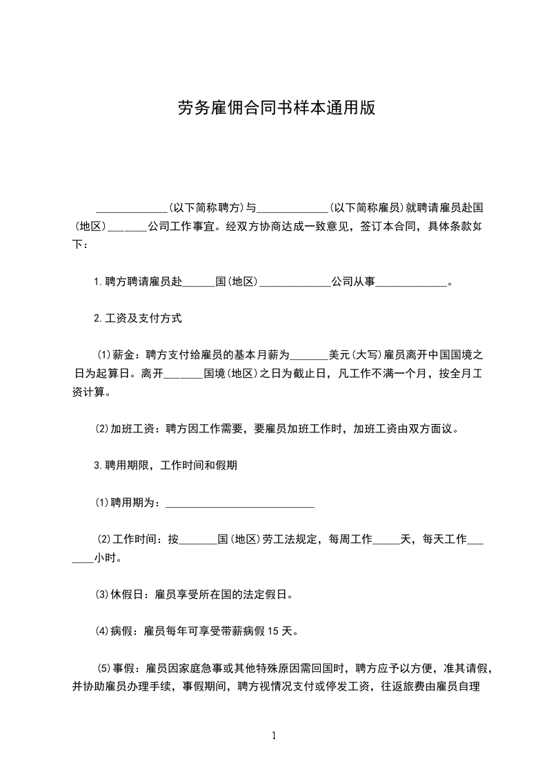 1.聘方聘请雇员赴______国(地区)_____________公司从事_____________。