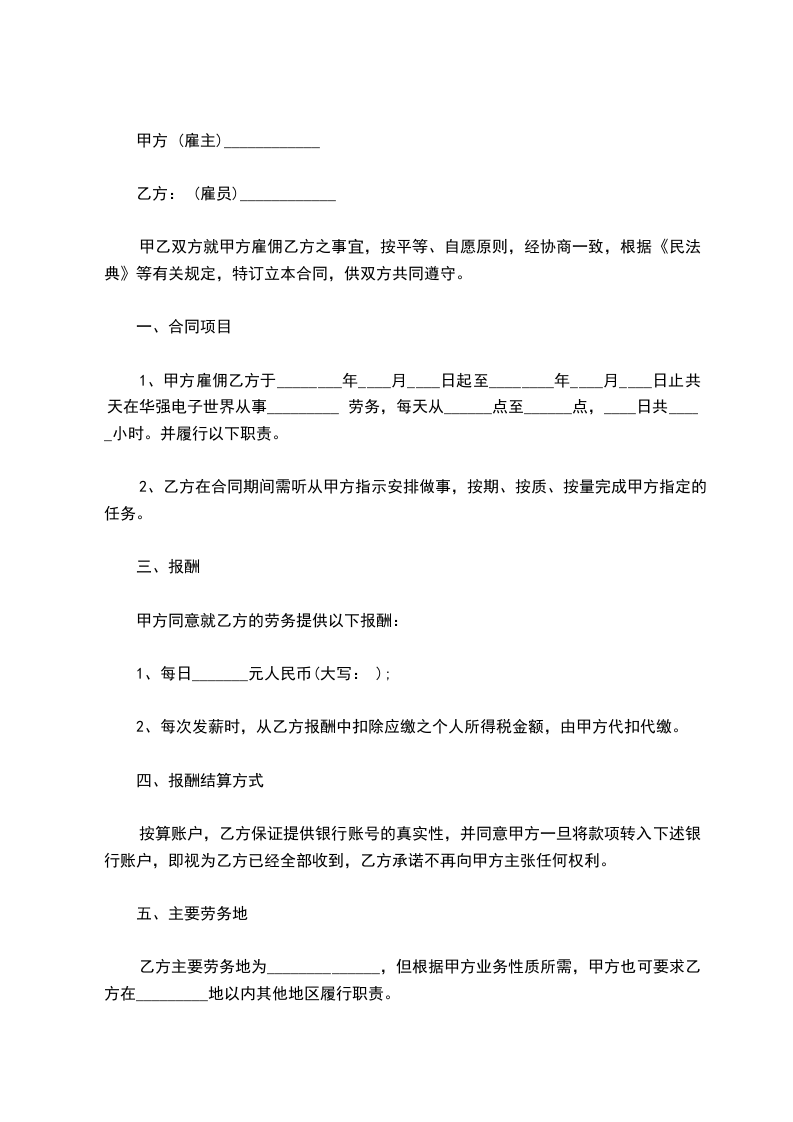 (2)加班工资:聘方因工作需要,要雇员加班工作时,加班工资由双方面议。