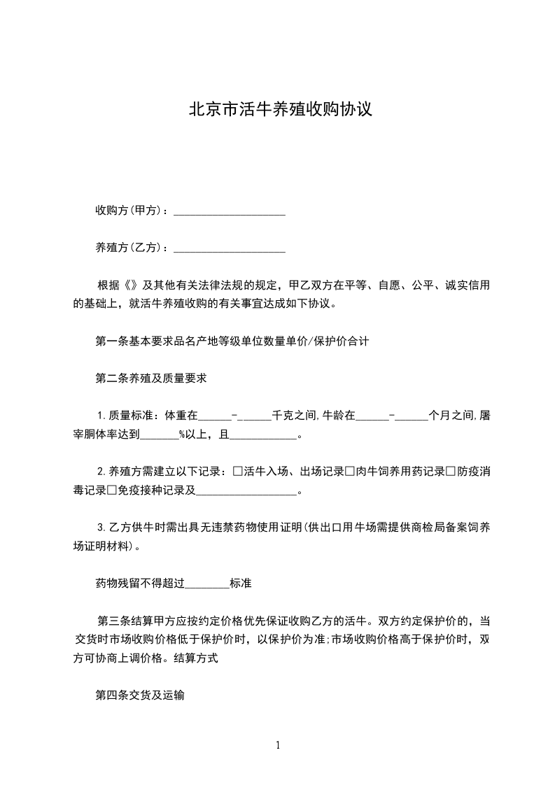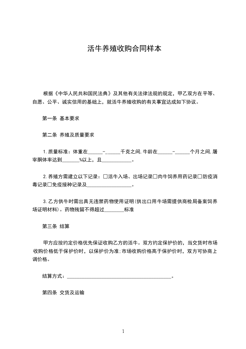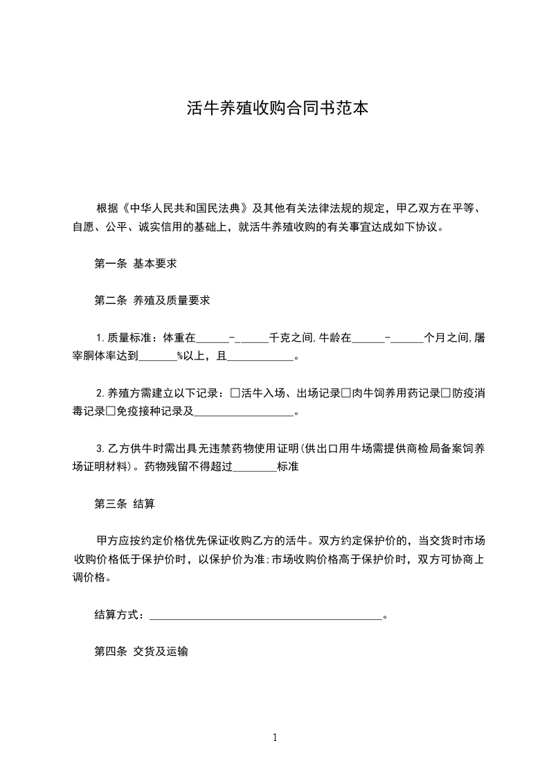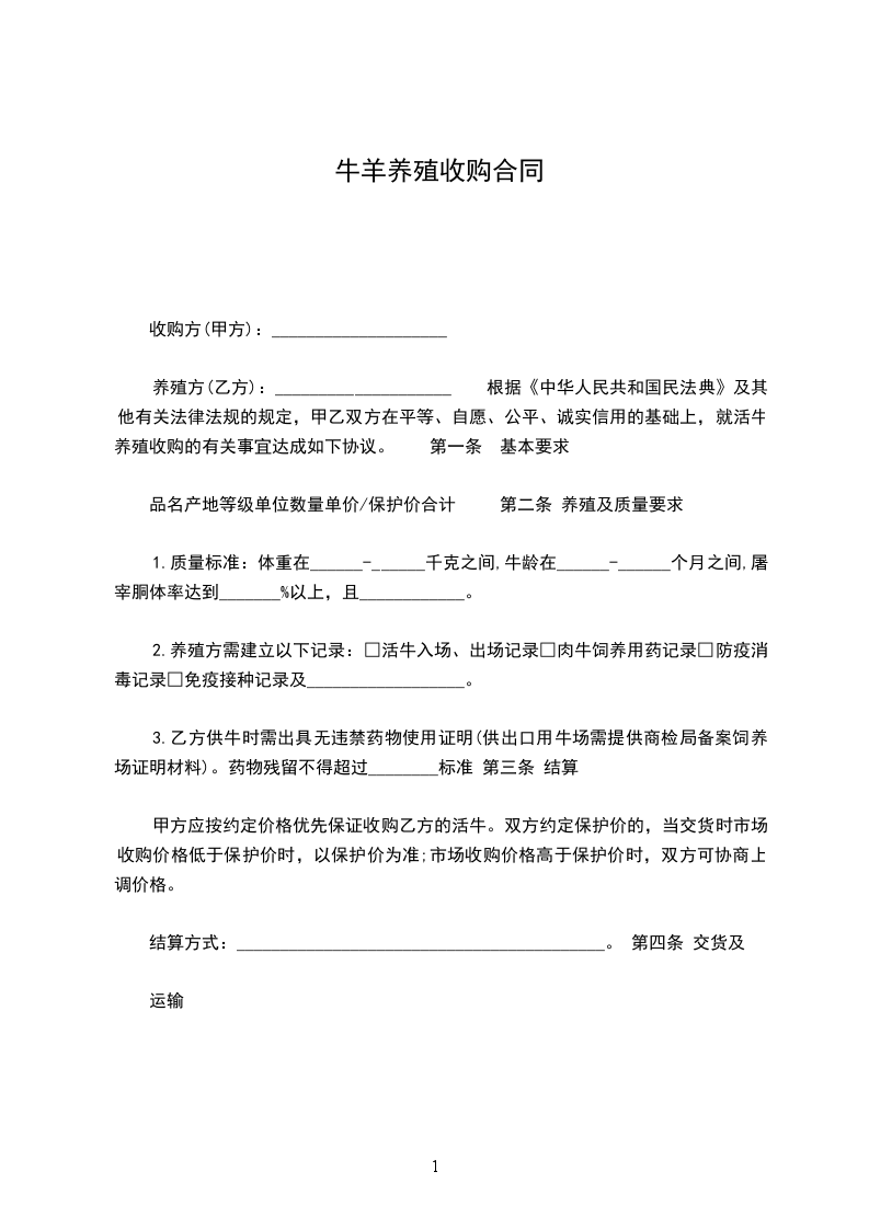 根据《中华人民共和国民法典》及其他有关法律法规的规定,甲乙双方在平等、自愿、公平、诚实信用的基础上,就活牛养殖收购的有关事宜达成如下协议。