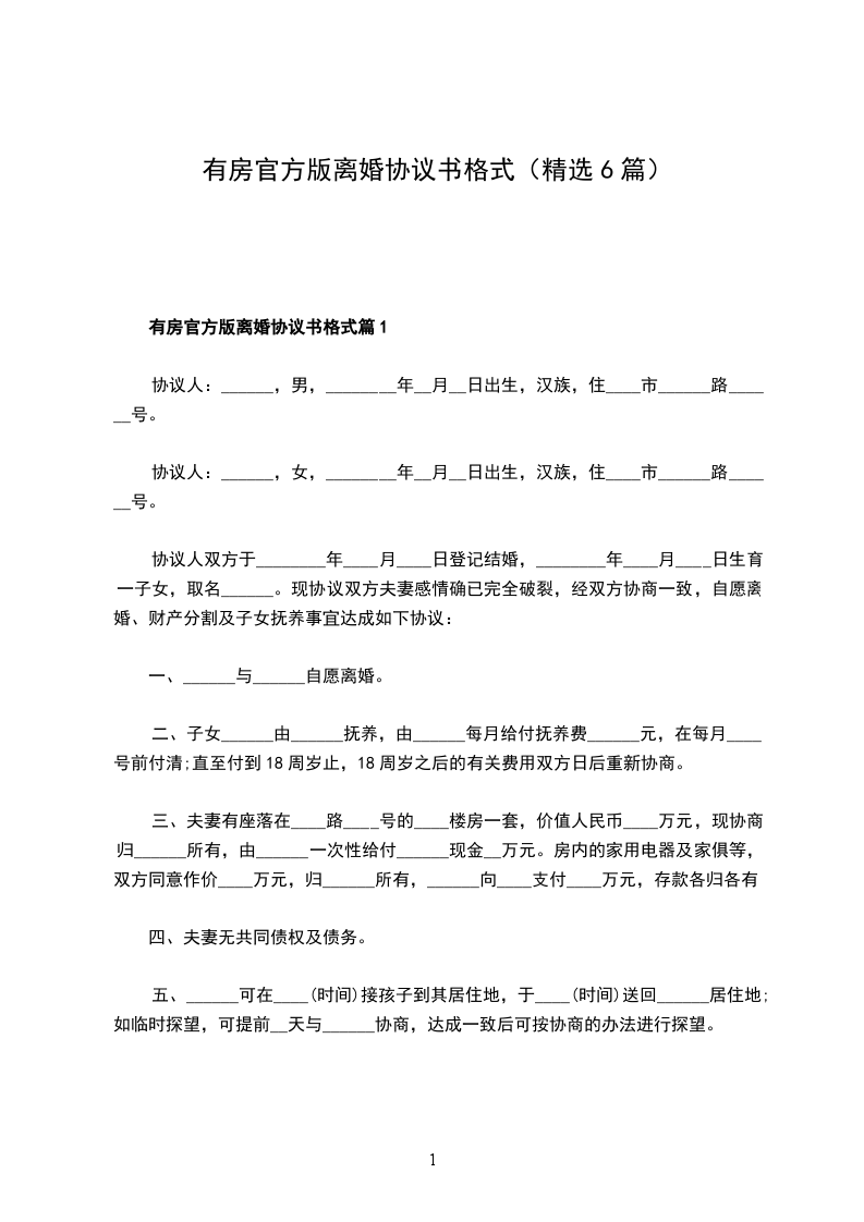 有房官方版离婚协议书格式篇1