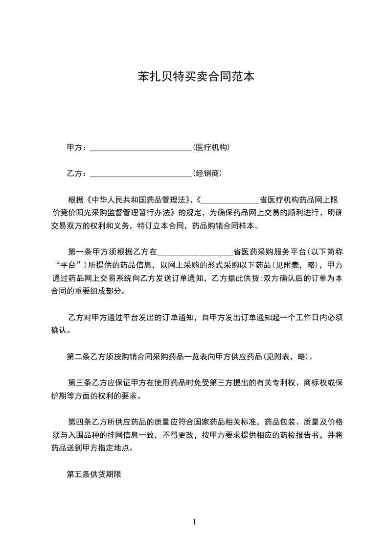 第一条甲方须根据乙方在__________________省医药采购服务平台(以下简称“平台”)所提供的药品信息,以网上采购的形式采购以下药品(见附表,略),甲方通过药品网上交易系统向乙方发送订单通知,乙方据此供货;双方确认后的订单为本合同的重要组成部分。