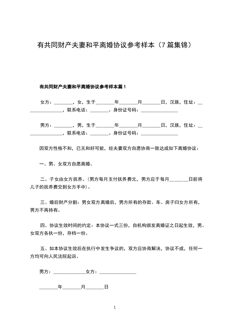 有共同财产夫妻和平离婚协议参考样本篇1
