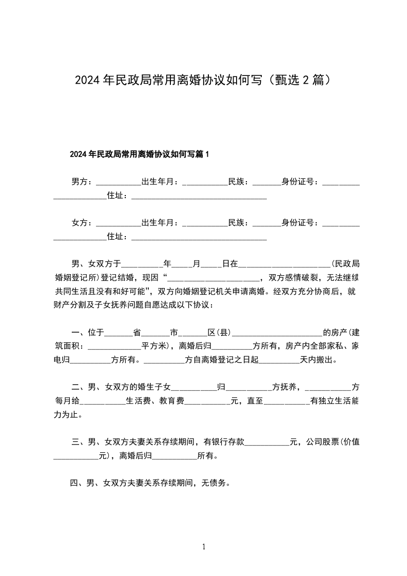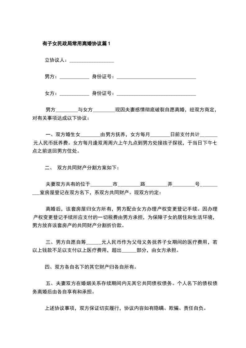 新版民政局常用离婚协议篇1