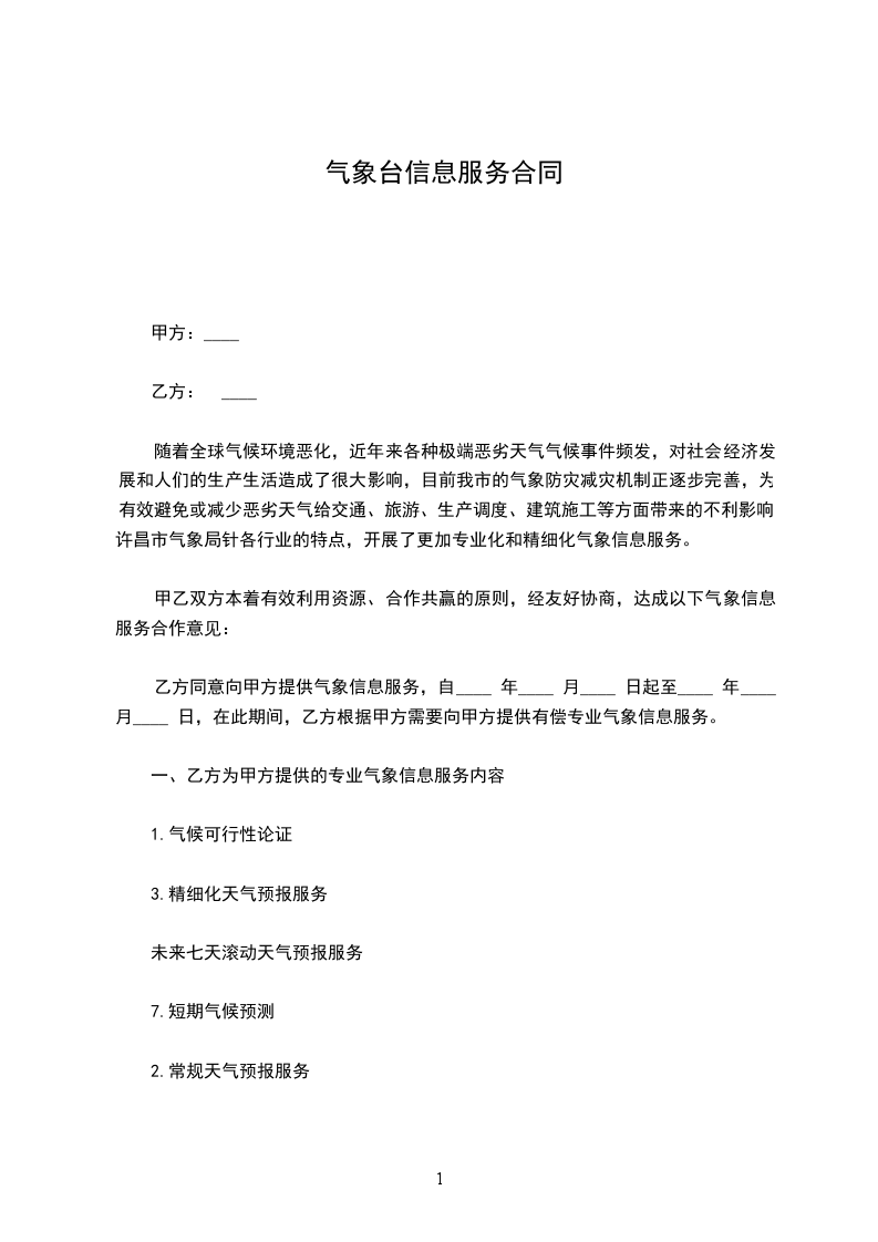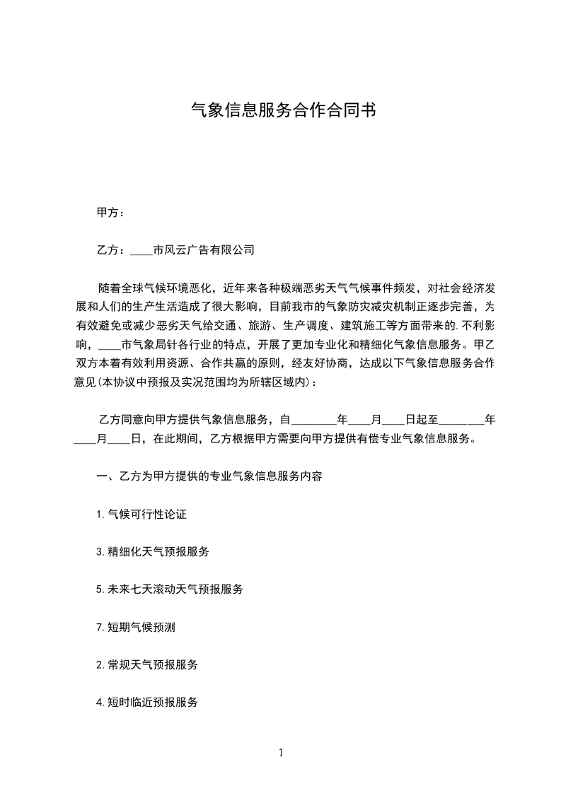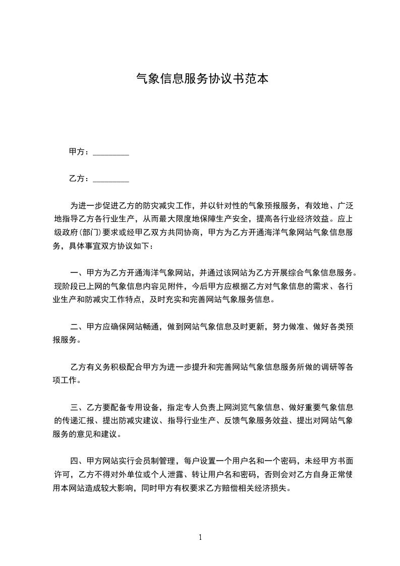 一、甲方为乙方开通海洋气象网站,并通过该网站为乙方开展综合气象信息服务。现阶段已上网的气象信息内容见附件,今后甲方应根据乙方对气象信息的需求、各行业生产和防减灾工作特点,及时充实和完善网站气象服务信息。