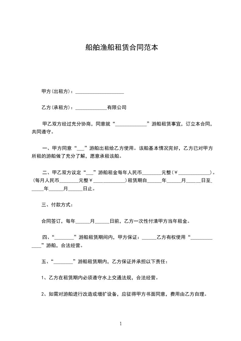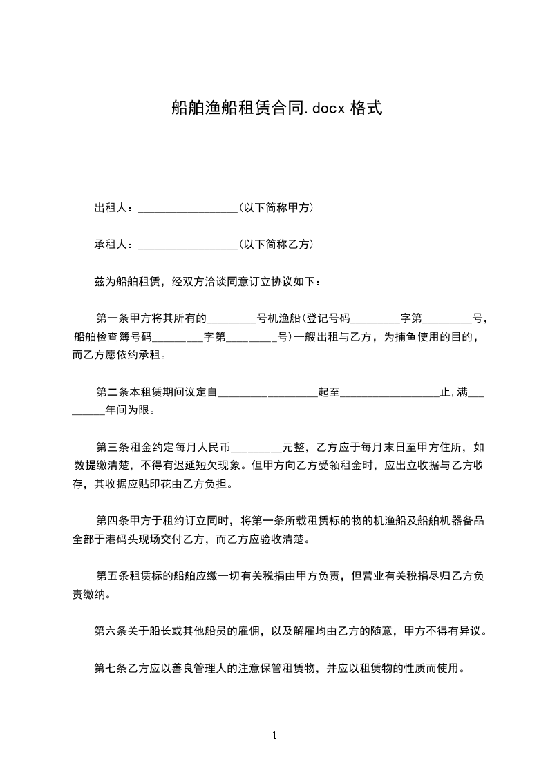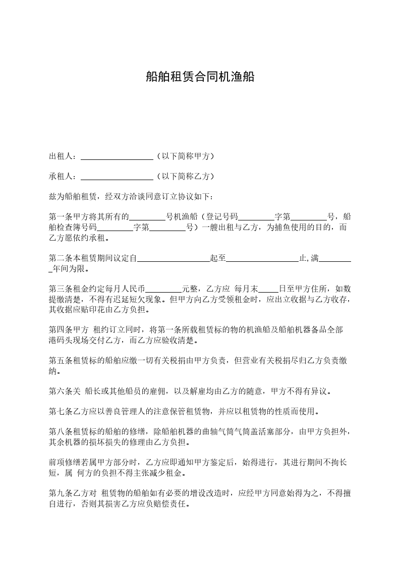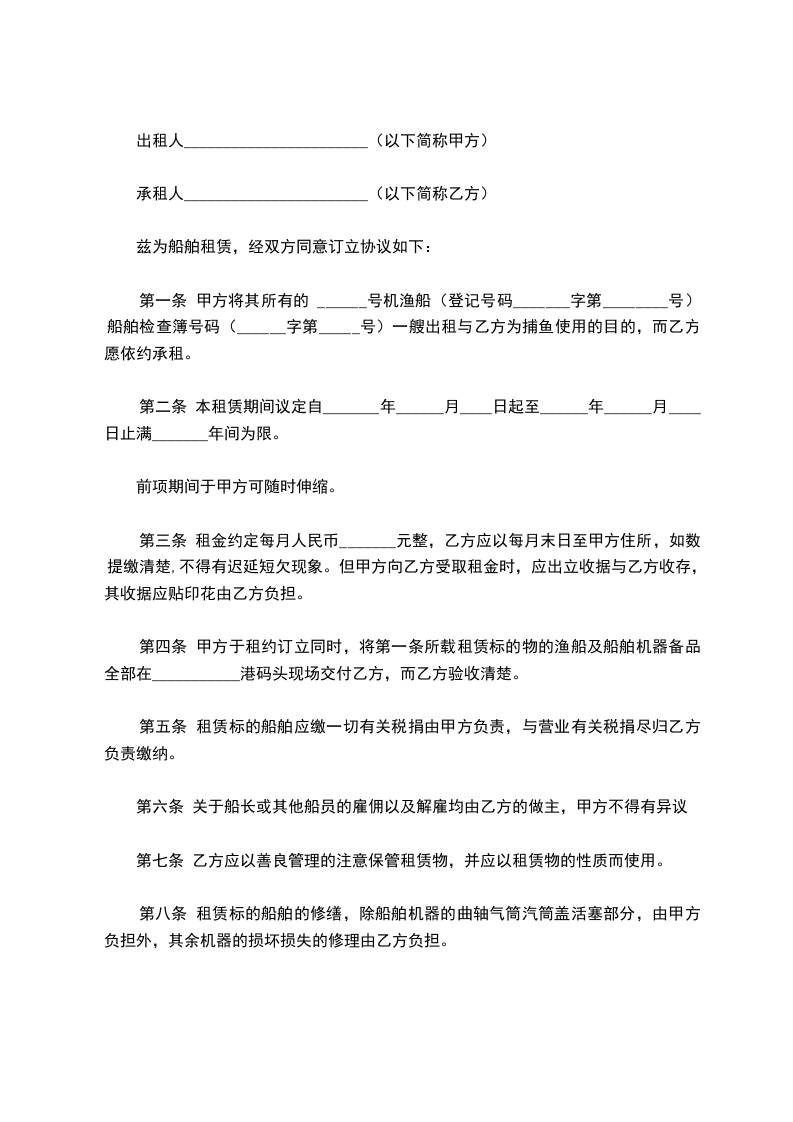 第一条 甲方将其所有的 ______号机渔船(登记号码_______字第________号)船舶检查簿号码(______字第_____号)一艘出租与乙方为捕鱼使用的目的,而乙方愿依约承租。