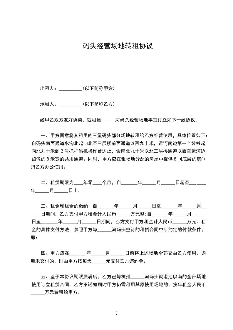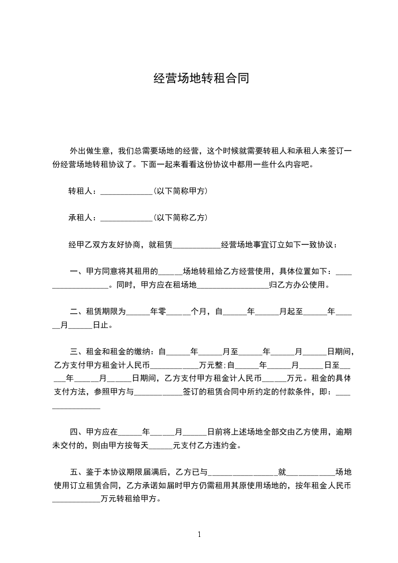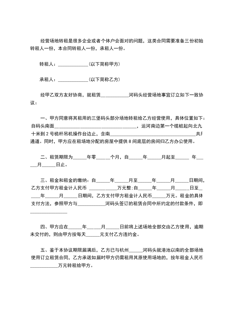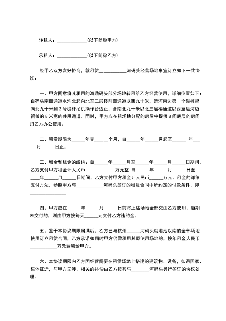 一、甲方同意将其租用的______场地转租给乙方经营使用,具体位置如下:__________________。同时,甲方应在租场地__________________归乙方办公使用。