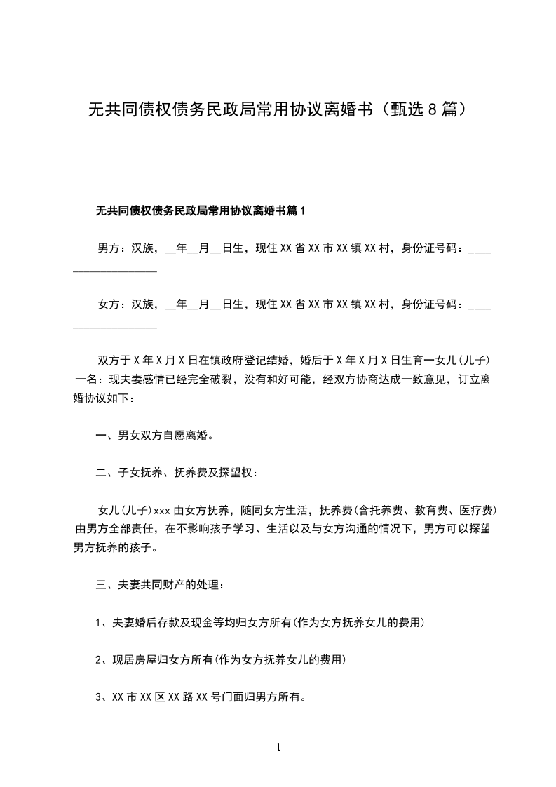 无共同债权债务民政局常用协议离婚书篇8