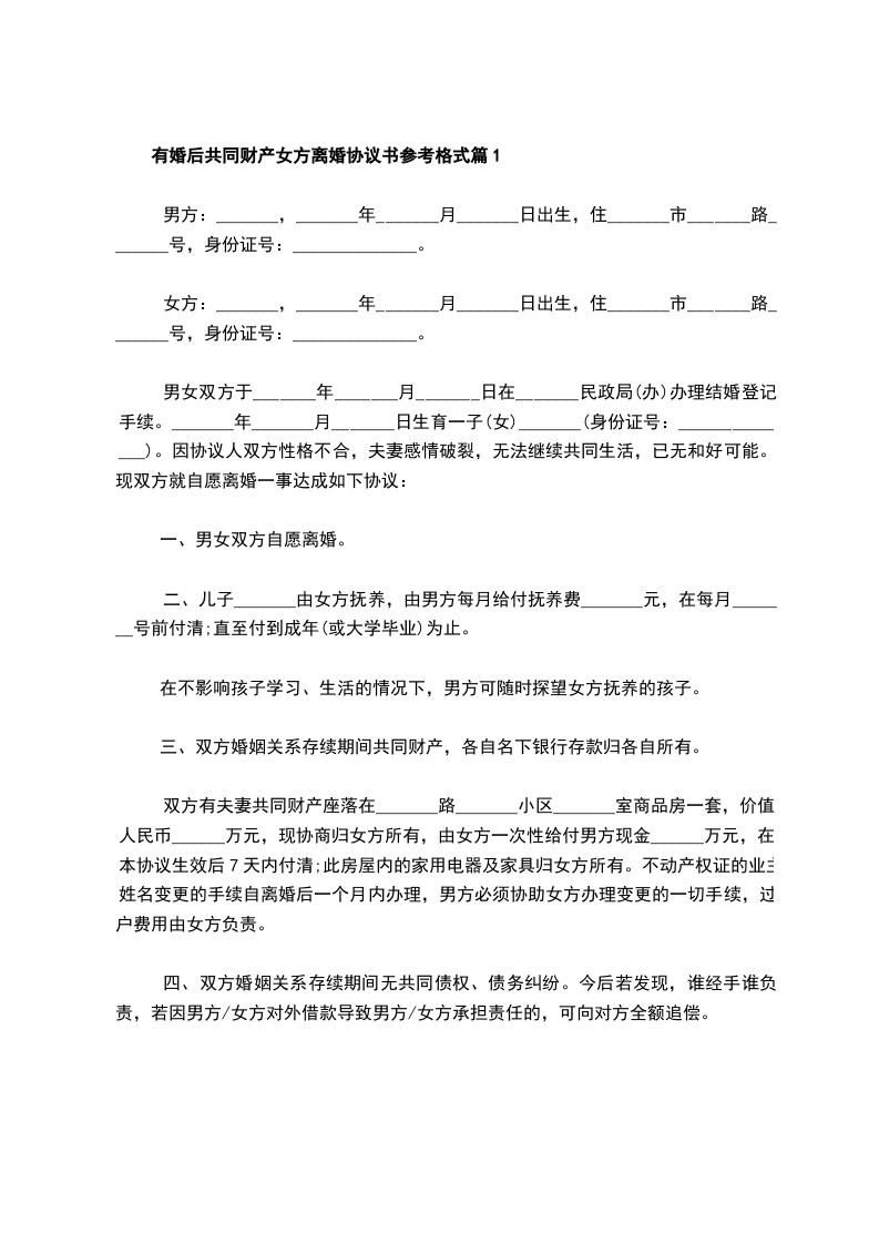 有婚后共同财产女方离婚协议书参考格式篇1