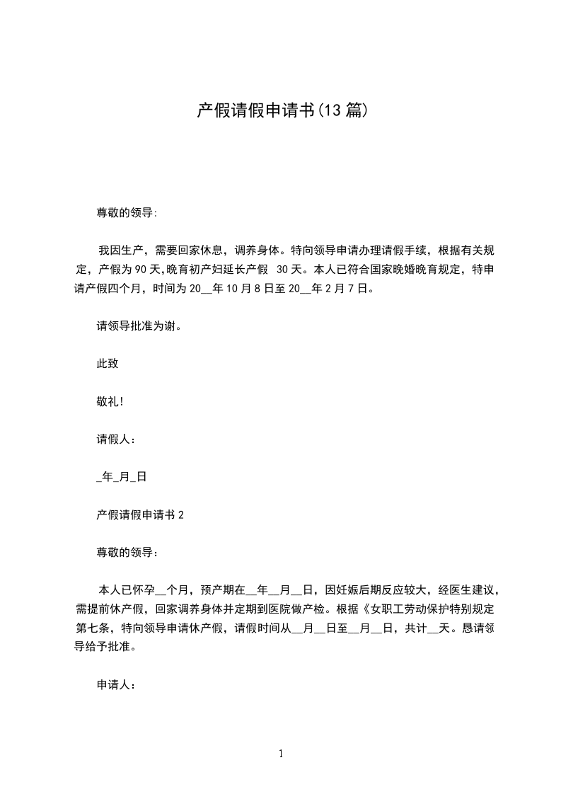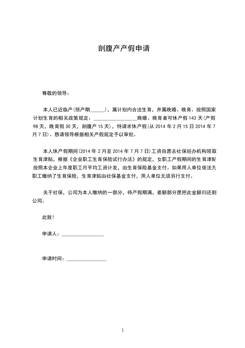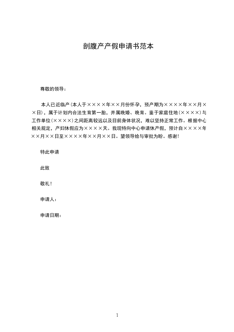 本人已近临产(本人于××××年××月份怀孕,预产期为××××年××月××日),属于计划内合法生育第一胎,并属晚婚、晚育。鉴于家庭住地(××××)与工作单位(××××)之间距离较远以及目前身体状况,难以坚持正常工作。根据中心相关规定,产妇休假应为××××天。我现特向中心申请休产假,预计自××××年××月××日至××××年××月××日。望领导给与审批为盼。感谢!