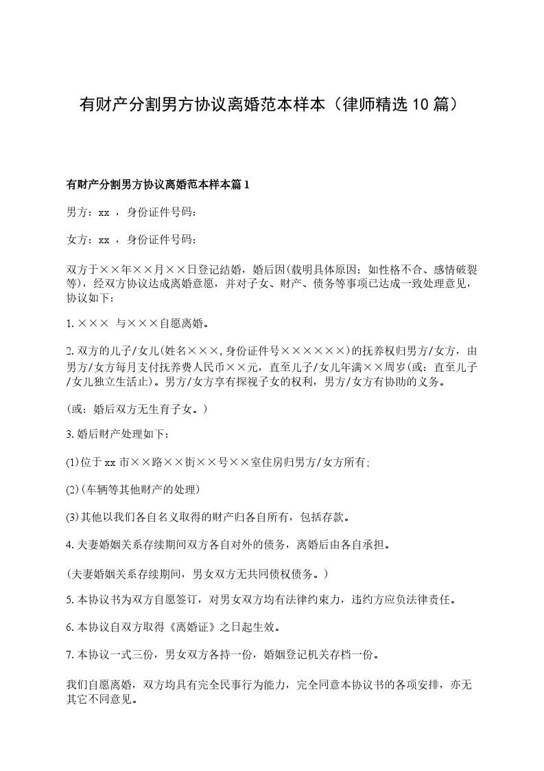 1、本协议一式三份,自婚姻登记机关颁发《离婚证》之日起生效,男、女双方各执一份,婚姻登记机关存档一份。