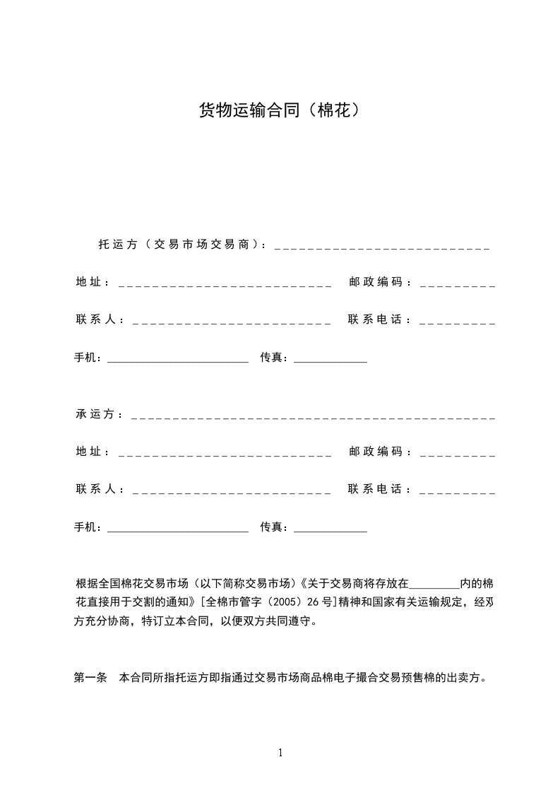 根据全国棉花交易市场(以下简称交易市场)《关于交易商将存放在_________内的棉花直接用于交割的通知》[全棉市管字(2005)26号]精神和国家有关运输规定,经双方充分协商,特订立本合同,以便双方共同遵守。