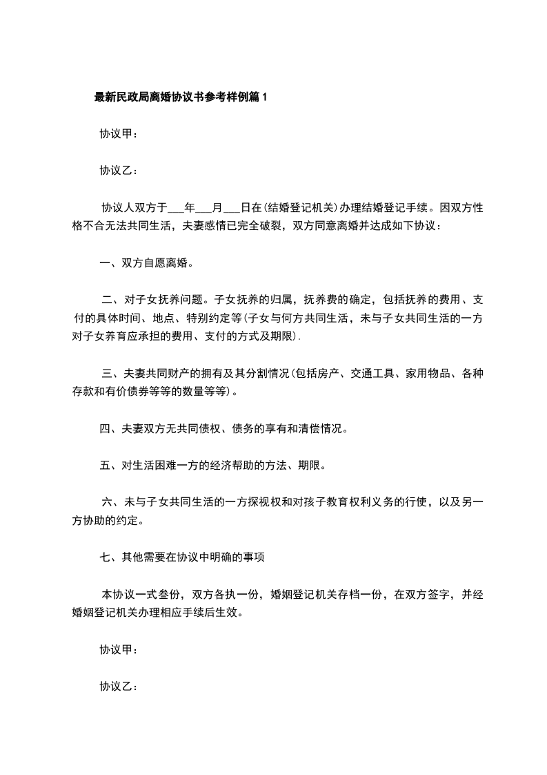 最新民政局离婚协议书参考样例篇1