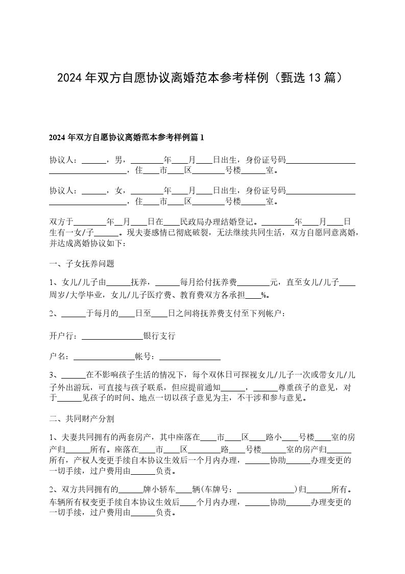 协议人双方于________年____月____日登记结婚,________年____月____日生育一子女,取名______。现协议双方夫妻感情确已完全破裂,经双方协商一致,自愿离婚、财产分割及子女抚养事宜达成如下协议: