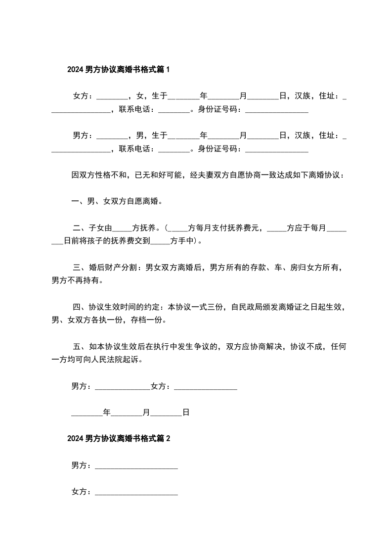 2024年男方协议离婚书参考样板篇2