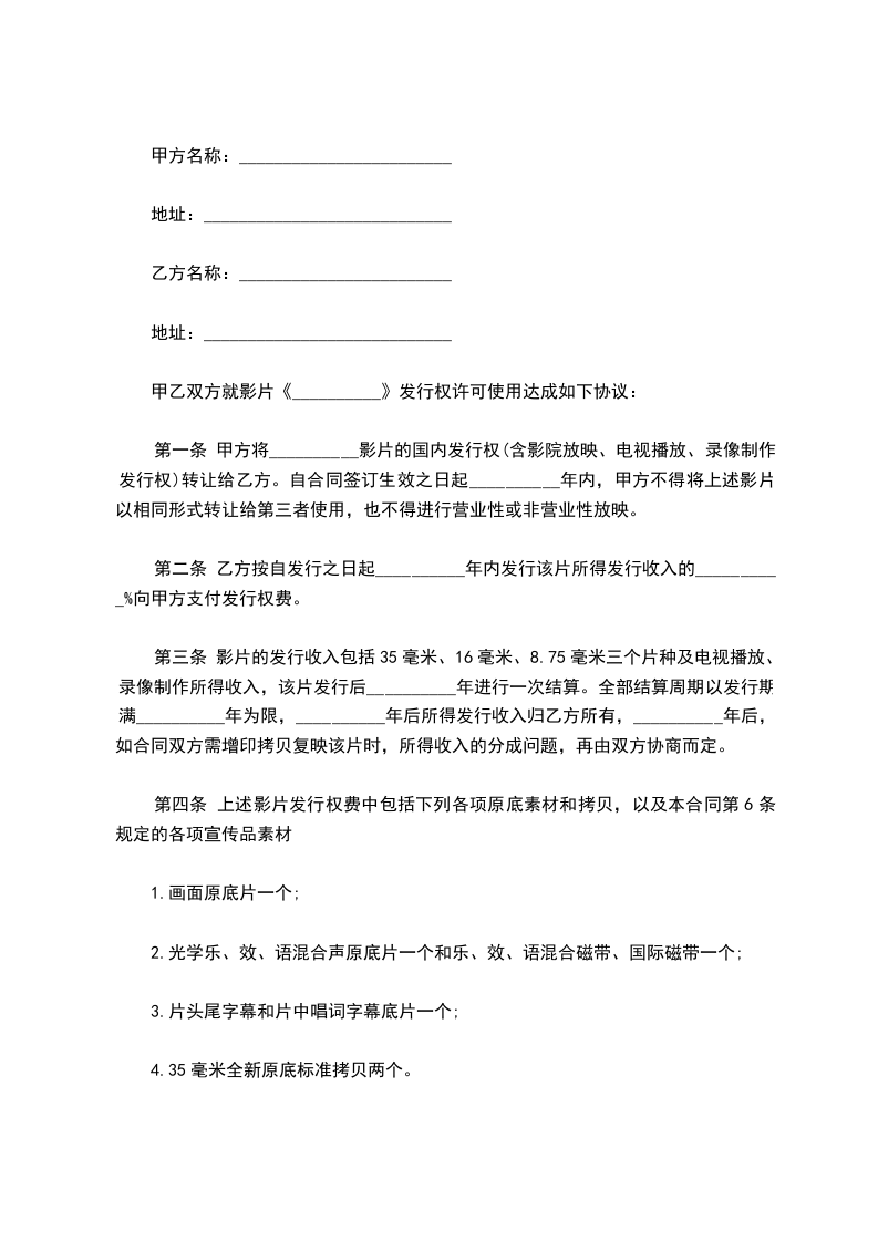 第二条 乙方按自发行之日起__________年内发行该片所得发行收入的__________%向甲方支付发行权费。