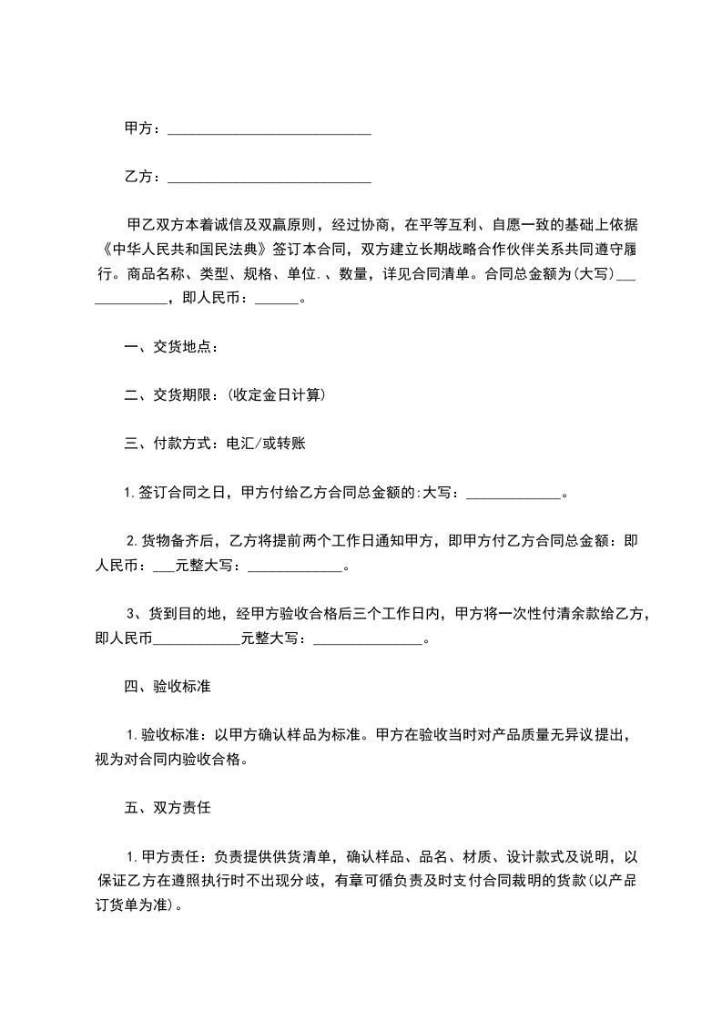 1、甲方责任:负责提供供货清单,确认样品、品名、材质、设计款式及说明,以保证乙方在遵照执行时不出现分歧,有章可循负责及时支付合同裁明的货款(以产品订货单为准)。