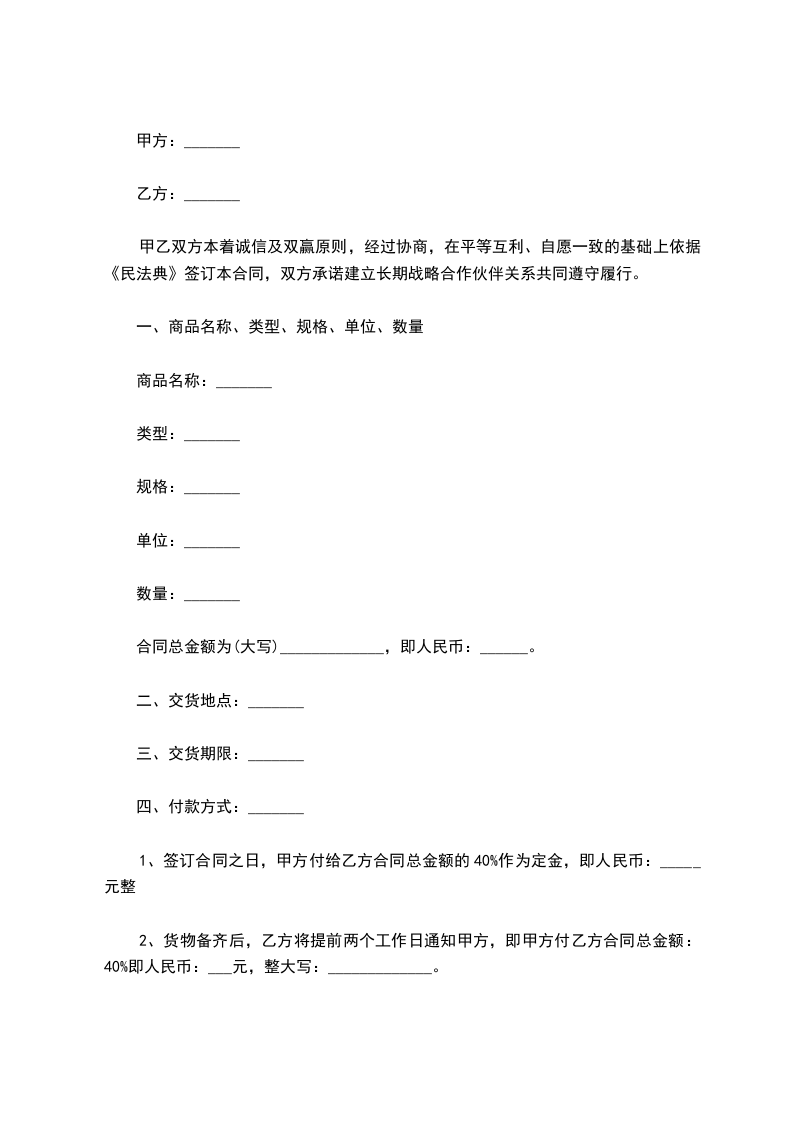 2、货物备齐后,乙方将提前两个工作日通知甲方,即甲方付乙方合同总金额:40%即人民币:___元,整大写:_____________。