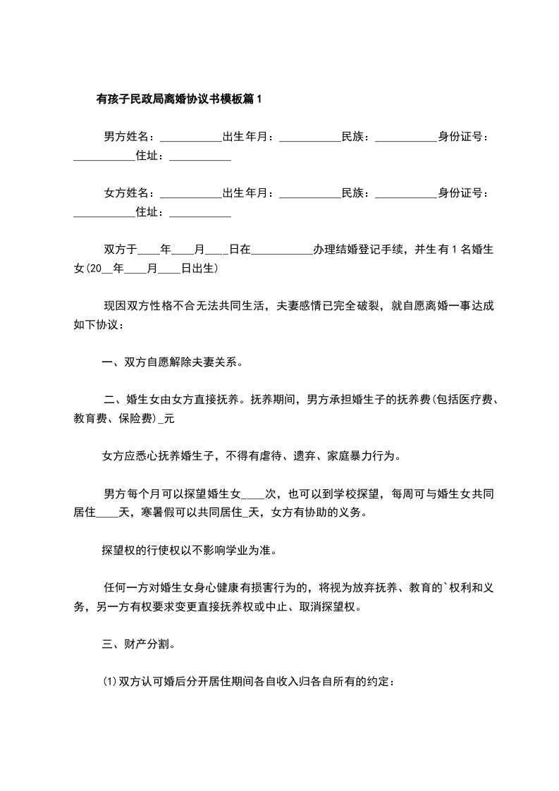 男方______与女方______于______年______月认识,于______年______月______日在______市民政局登记结婚,婚后于______年______月______日生育一儿子,名______。两人因性格不合,致使夫妻感情破裂,已无和好可能,现经夫妻双方自愿协商达成一致意见,订立离婚协议如下: