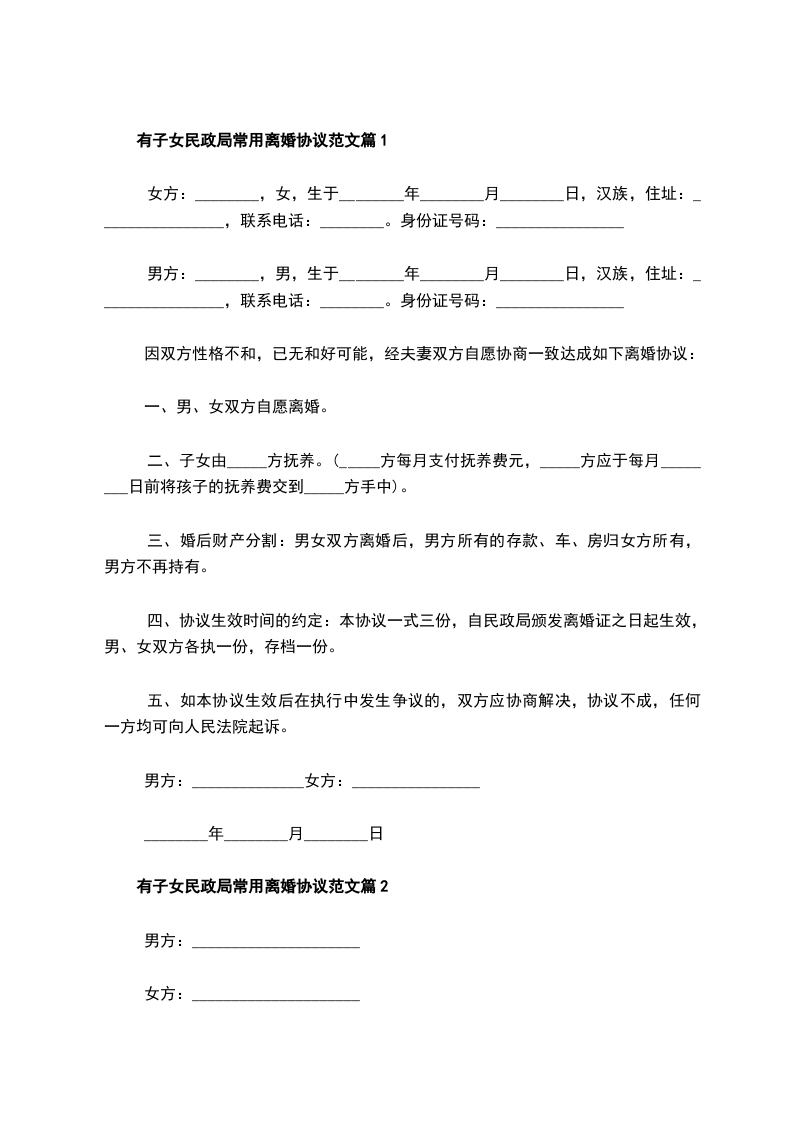 男女双方于_______年_______月_______日在_______民政局(办)办理结婚登记手续。_______年_______月_______日生育一子(女)_______(身份证号:______________)。因协议人双方性格不合,夫妻感情破裂,无法继续共同生活,已无和好可能。现双方就自愿离婚一事达成如下协议: