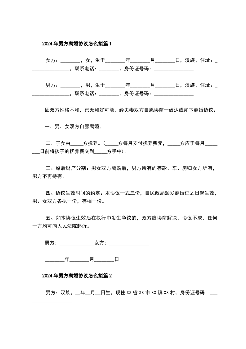 2024年男方离婚协议怎么拟篇2