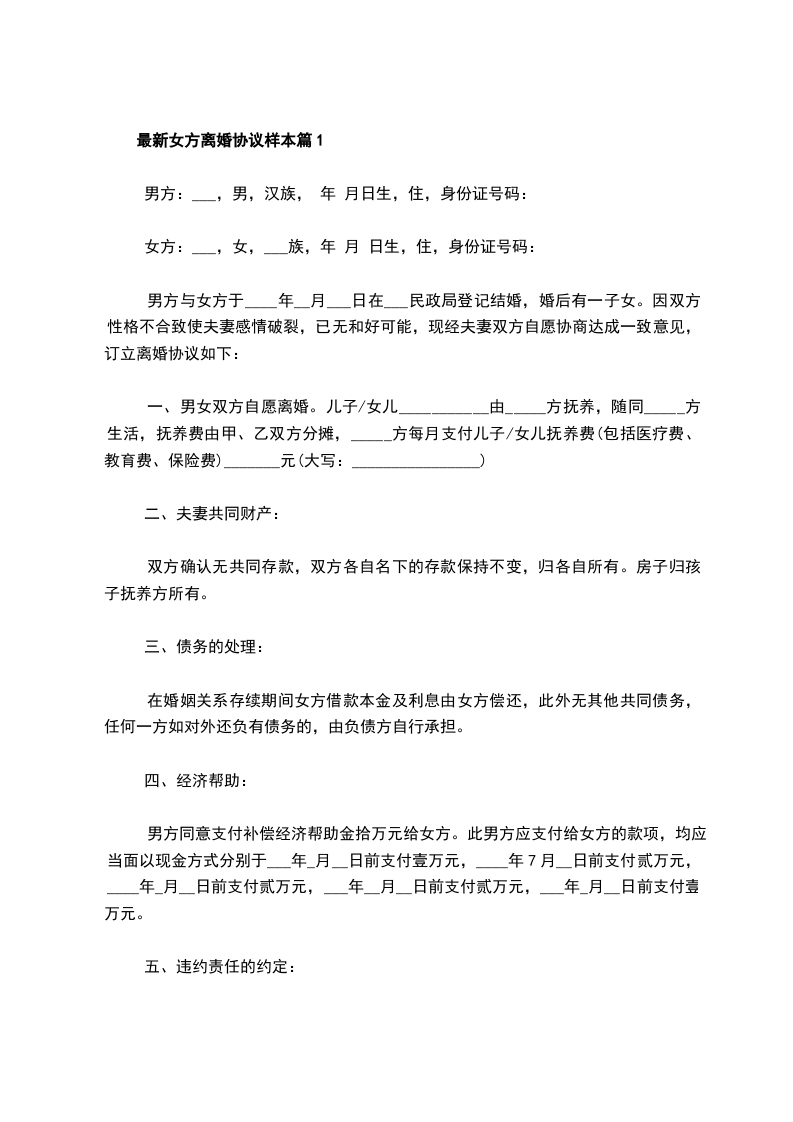 女方:________,女,生于________年________月________日,汉族,住址:________________,联系电话:________。身份证号码:________________