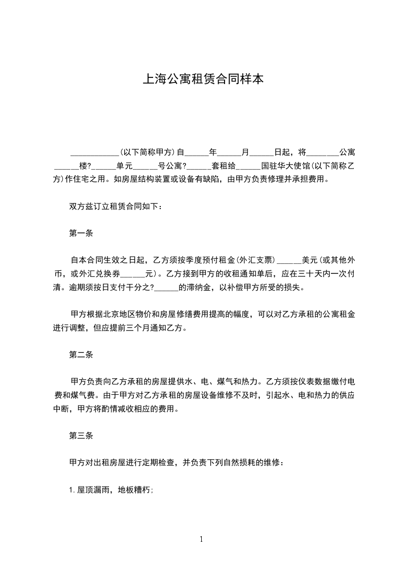 ____________(以下简称甲方)自______年______月______日起,将________公寓______楼?______单元______号公寓?______套租给______国驻华大使馆(以下简称乙方)作住宅之用。如房屋结构装置或设备有缺陷,由甲方负责修理并承担费用。