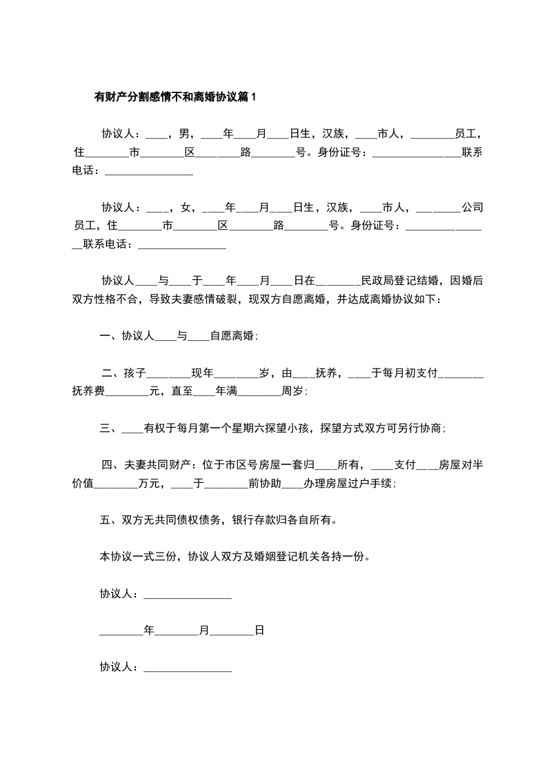 有财产分割无出轨离婚协议篇1