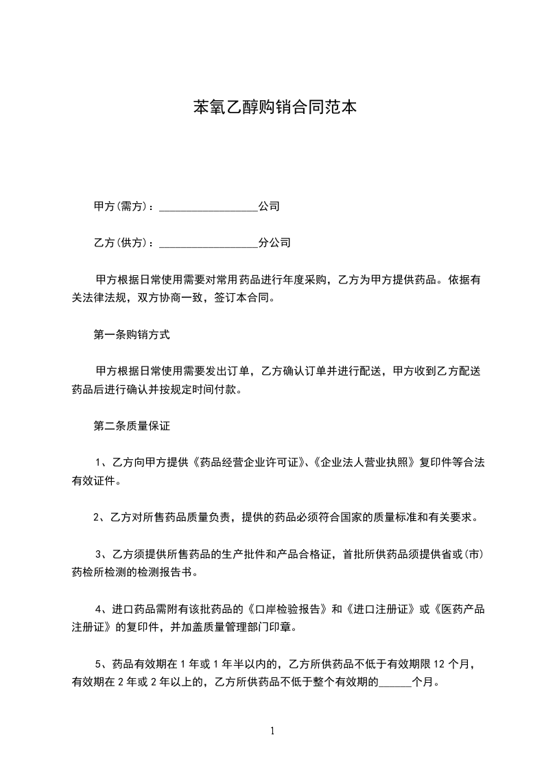 根据《中华人民共和国民法典》,甲、乙双方经协商确定,甲方向乙方购买药品。为明确双方责任和权利,特签订本合同,共同遵守。具体条款如下: