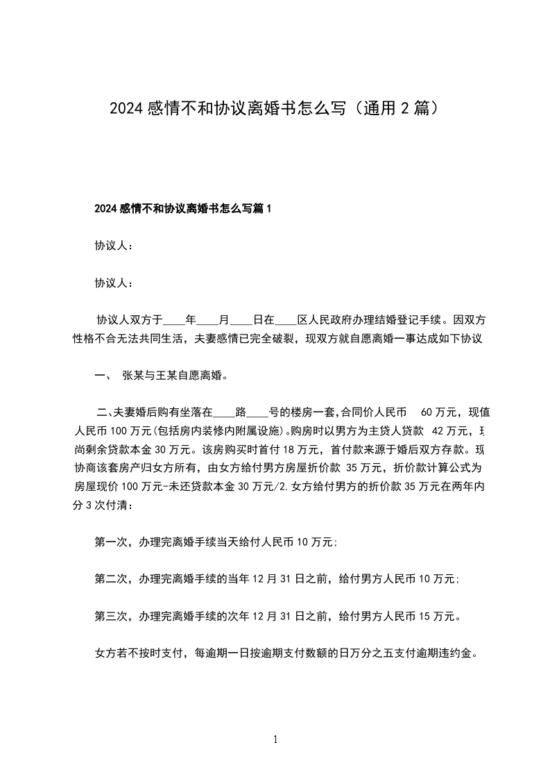 男女双方于____年__月__日在__________婚姻登记部门办理结婚登记手续,结婚证号码__________,婚后于____年__月__日生育一个儿子(女儿),名______。因双方性格不合无法共同生活,夫妻感情已经完全破裂,没有和好可能,经双方就自愿离婚事宜达成一致意见,订立离婚协议如下: