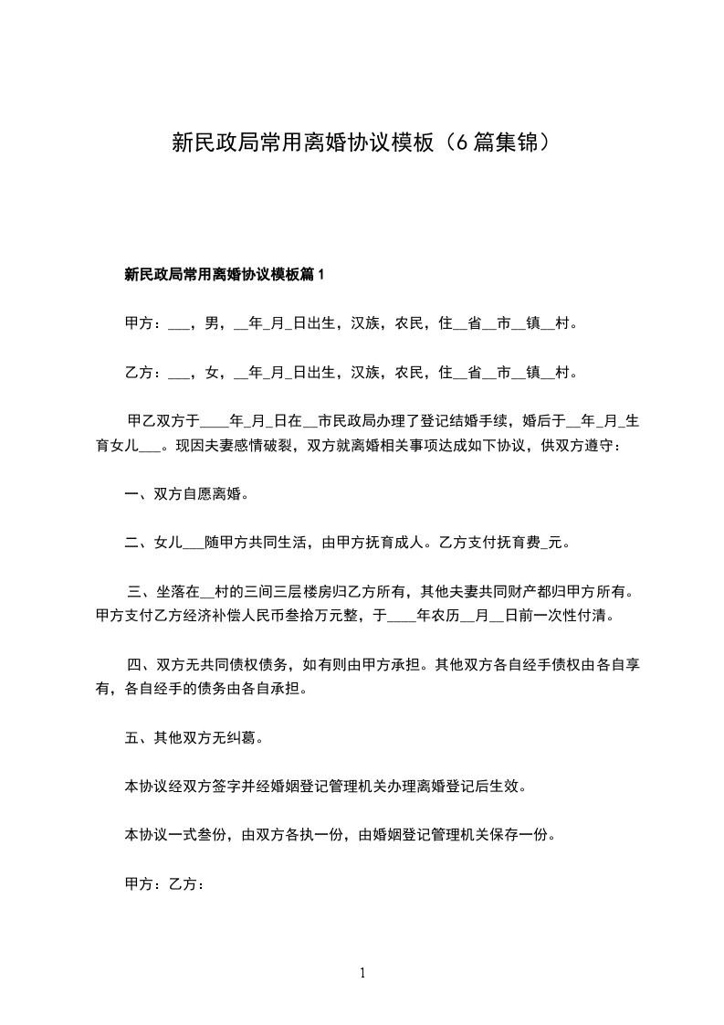关于民政局离婚协议范文篇1