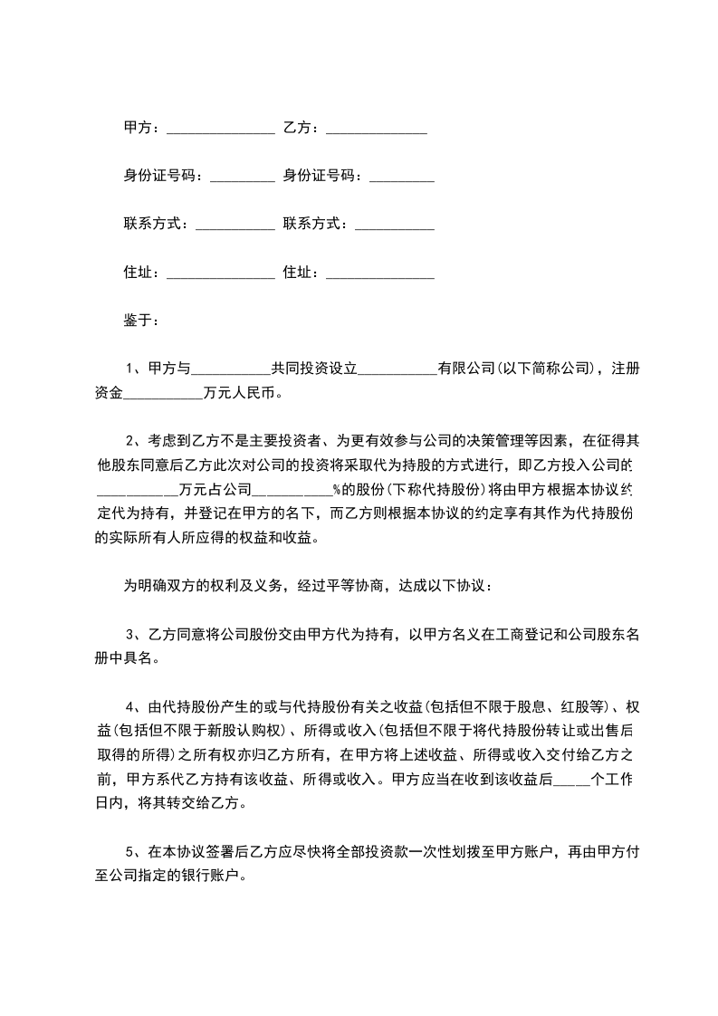 2、考虑到乙方不是主要投资者、为更有效参与公司的决策管理等因素,在征得其他股东同意后乙方此次对公司的投资将采取代为持股的方式进行,即乙方投入公司的___________万元占公司___________%的股份(下称代持股份)将由甲方根据本协议约定代为持有,并登记在甲方的名下,而乙方则根据本协议的约定享有其作为代持股份的实际所有人所应得的权益和收益。