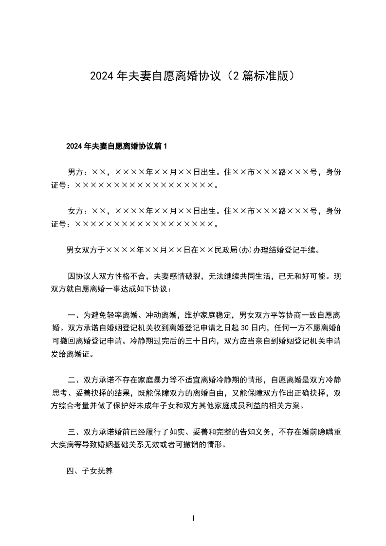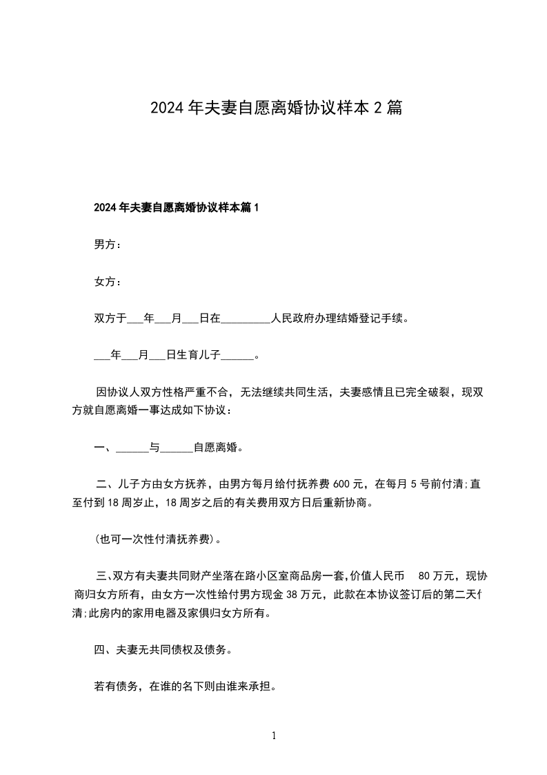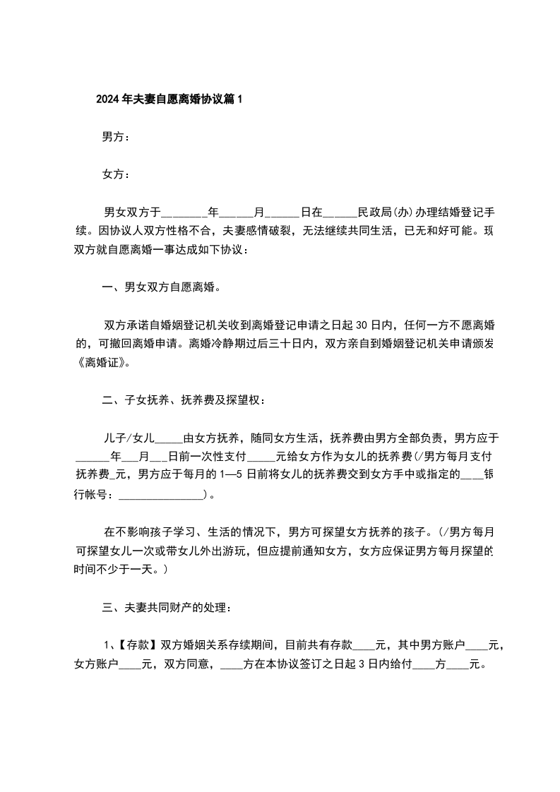 2024年夫妻自愿离婚协议样本篇1