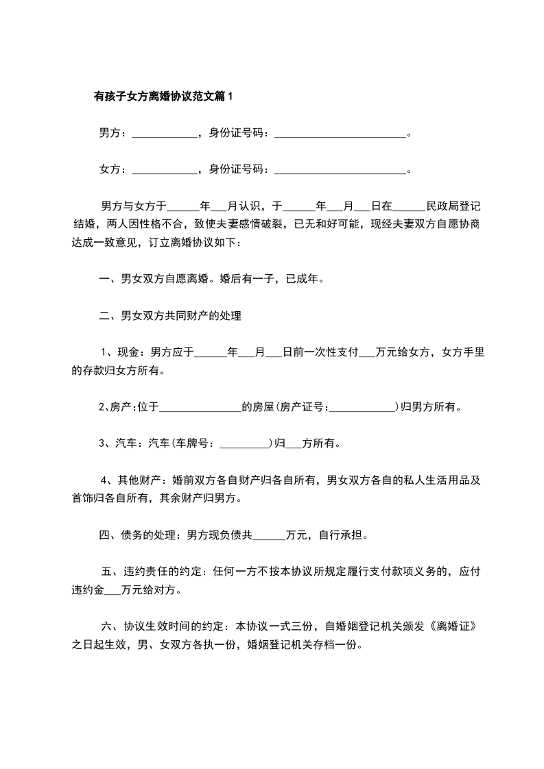 有孩子女方离婚协议范文篇1
