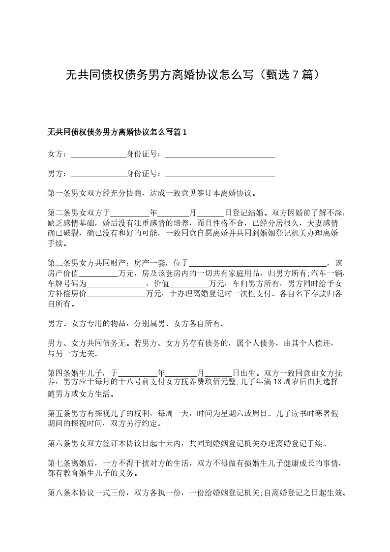 无共同债权债务男方离婚协议怎么写篇7