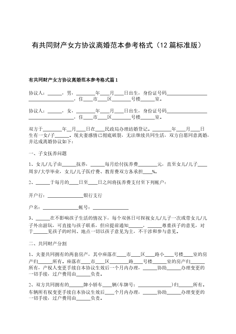 1、______地的1幢住房属双方共同财产,该房屋所有权证编号为__________________,该房屋归女方所有;