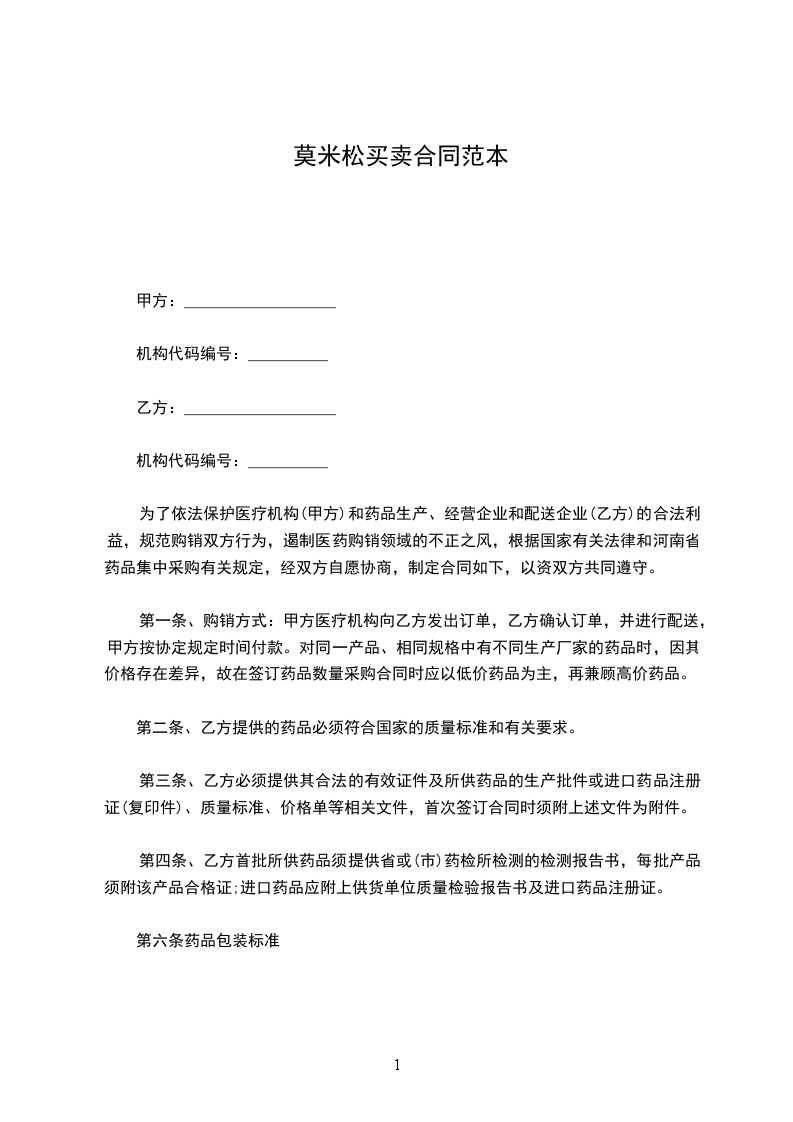 为了依法保护医疗机构(甲方)和药品生产、经营企业和配送企业(乙方)的合法利益,规范购销双方行为,遏制医药购销领域的不正之风,根据国家有关法律和河南省药品集中采购有关规定,经双方自愿协商,制定合同如下,以资双方共同遵守。